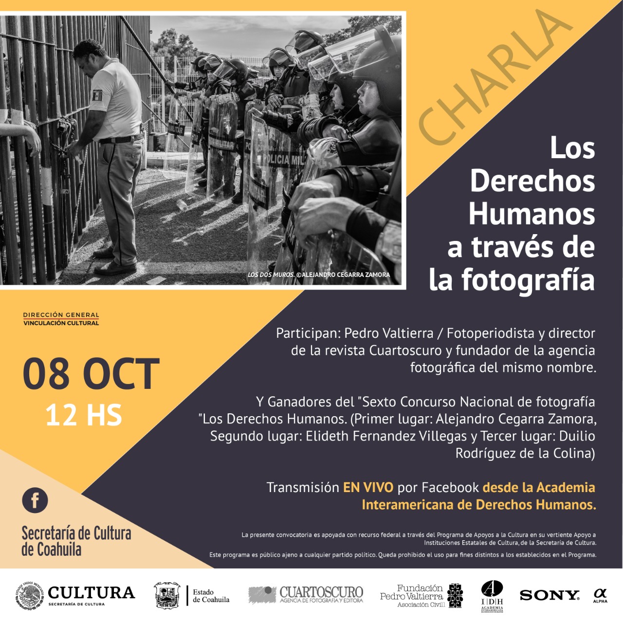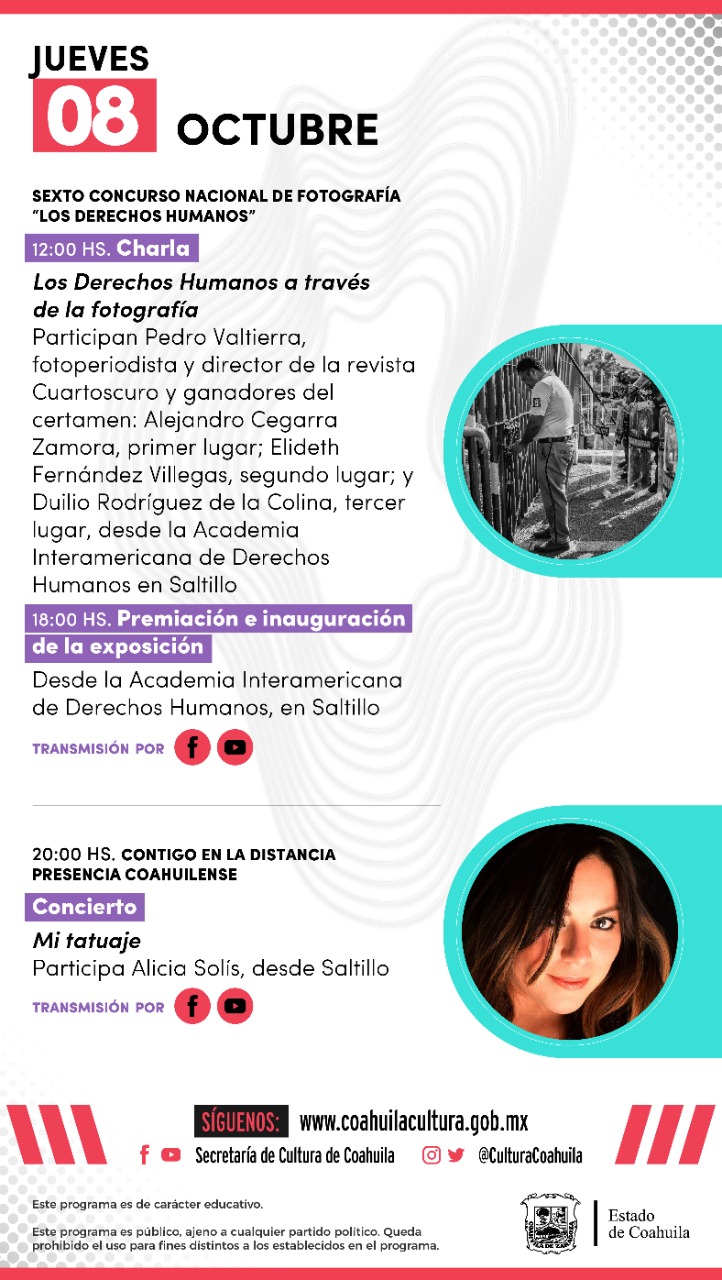 El 8 de octubre, a las 12:00 horas la charla de “Los Derechos Humanos a través de la fotografía”. Y a las 18:00 horas continúa en ese mismo tenor la exposición e inauguración del Sexto Concurso Nacional de Fotografía “Los Derechos Humanos”.