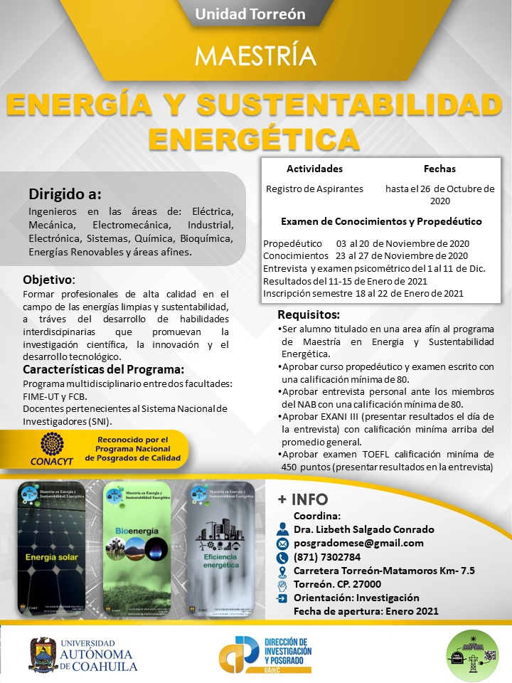 Torreón.- La Facultad de Ciencias Biológicas Unidad Torreón de la Universidad Autónoma de Coahuila, convoca a egresados de nivel licenciatura en áreas afines a la Ingeniería Mecánica, Eléctrica, Electrónica, Mecatrónica, Sistemas, Industrial, Química, Bioquímica y Biotecnología a cursar la maestría en Energía y Sustentabilidad Energética que apertura en enero de 2021.