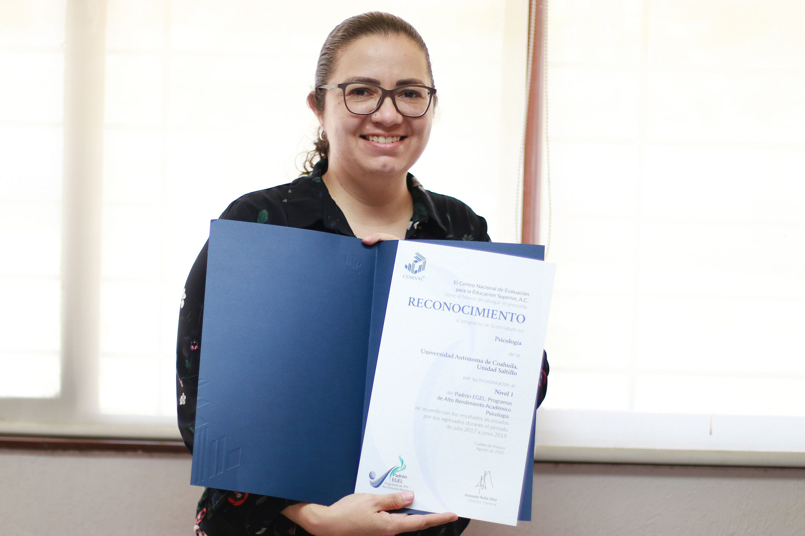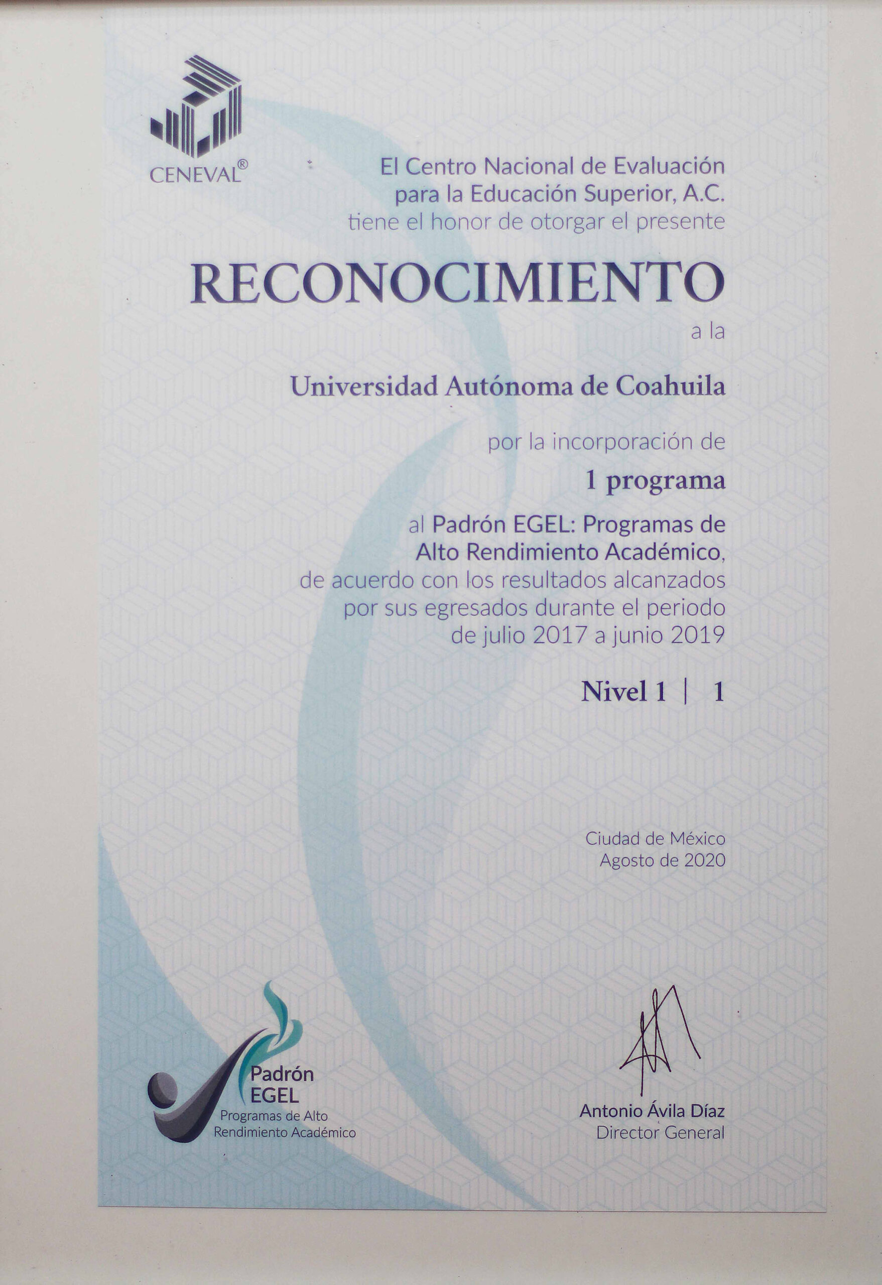 La Facultad de Psicología Unidad Saltillo de la Universidad Autónoma de Coahuila, recibió el reconocimiento del CENEVAL que la acredita dentro del Nivel 1 del Padrón EGEL: Programa de Alto Rendimiento Académico, por los resultados obtenidos en la prueba EGEL durante el periodo julio 2017- junio 2019.