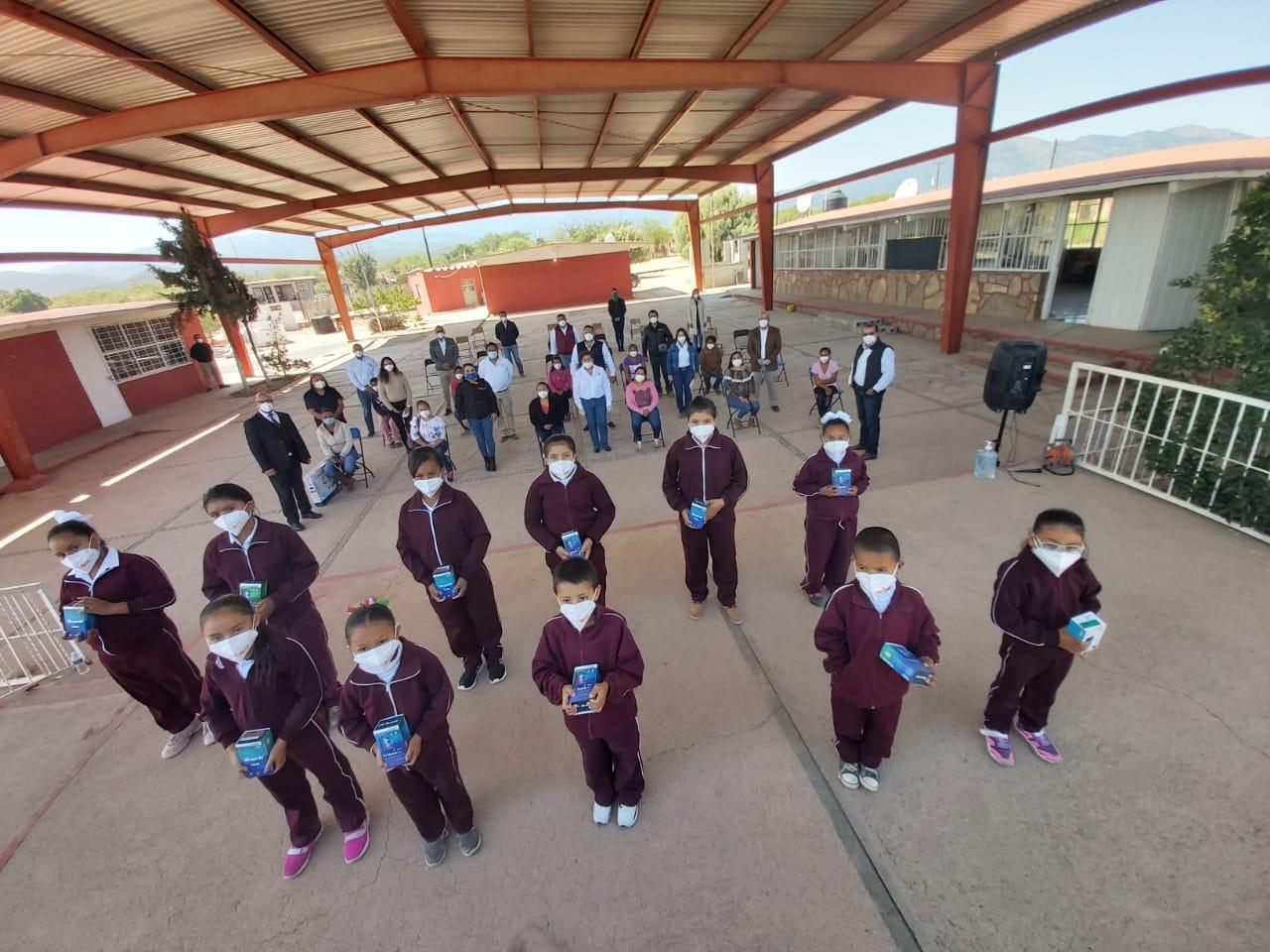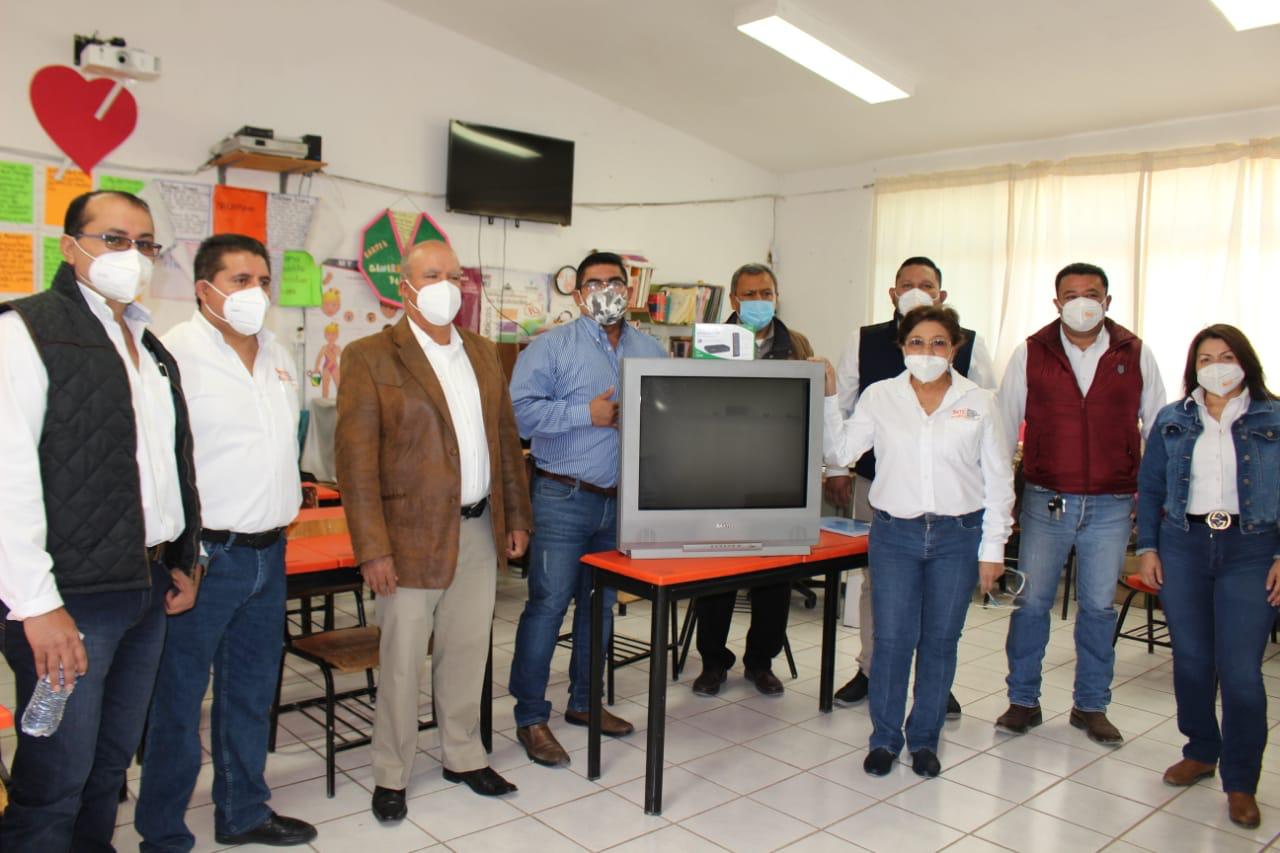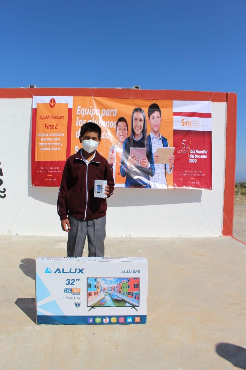 Rincón Chanona, indico que en esta primera etapa de entrega se acudió al Ejido Presa de San Pedro, donde a nombre del maestro Alfonso Cepeda Salas líder nacional del SNTE, y acompañada del Representante del CEN maestro Omar Pereyra Pérez e integrantes del Comité Ejecutivo seccional entregó en la Telesecundaria “14 de marzo” una pantalla, y 8 celulares a los alumnos que más lo necesitaban, ahí mismo se entregó un televisor y decodificador para un joven del Ejido La Hedionda, en la Escuela Primaria “Emilio Carranza” una pantalla y 13 teléfonos celulares, en Puerto de Rocamontes se entregaron 3 celulares a los alumnos de la primaria “Rodrigo Macías Mata” y en la Colonia Valle de Santa Elena una pantalla para un alumno del jardín de niños “Amado Nervo”.