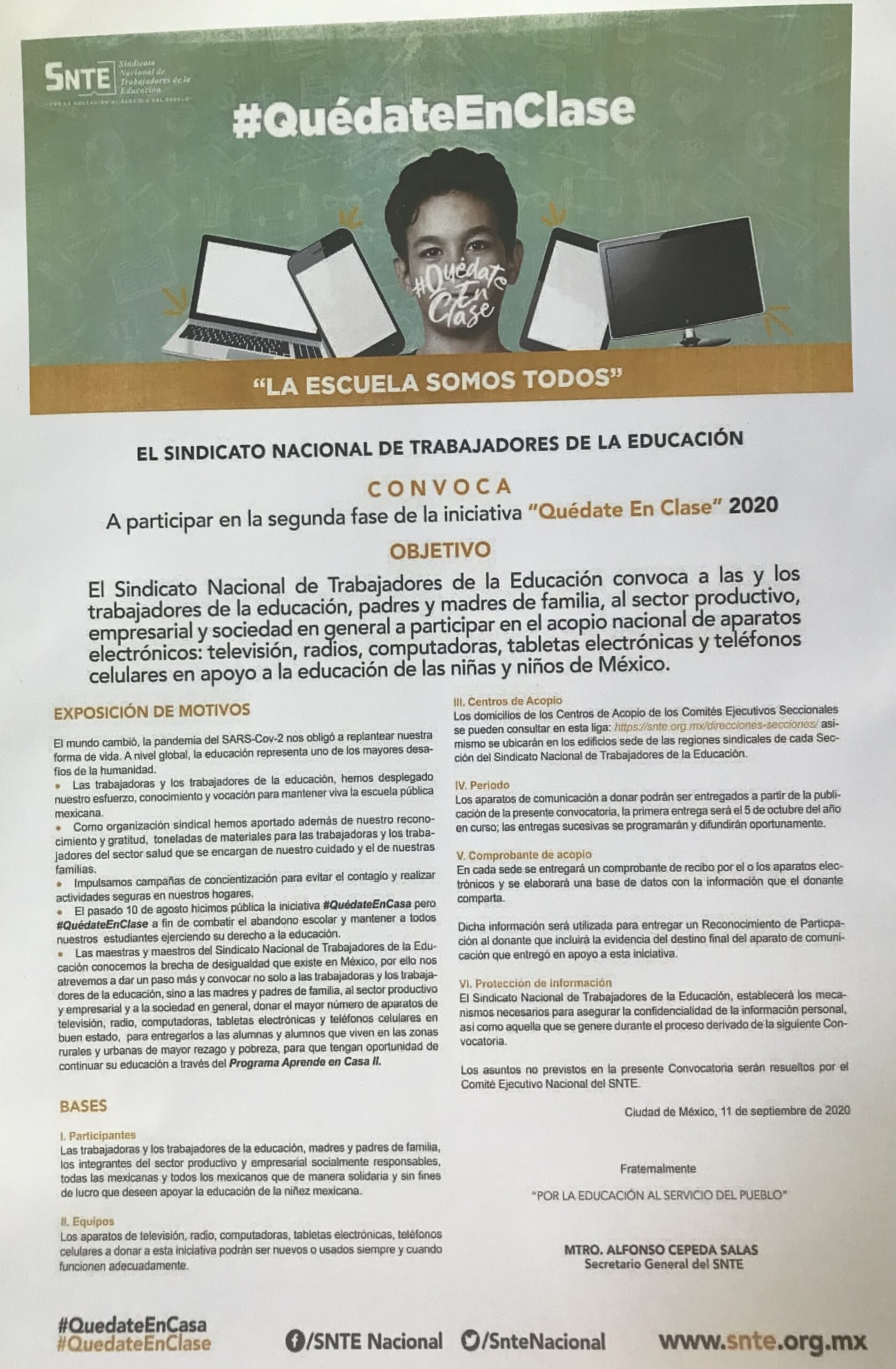 El Sindicato Nacional de Trabajadores de la Educación (SNTE) convoca a toda la población de Ramos Arizpe, miembros del propio sindicato, jubilados, sector productivo, padres y madres de familia a participar en la segunda fase nacional de la iniciativa “Quédate en Clase 2020” con el objetivo de ayudar en el acopio de aparatos electrónicos como televisiones, radios, computadoras, tabletas electrónicas y teléfonos celulares para apoyar a la educación de los niños y niñas.