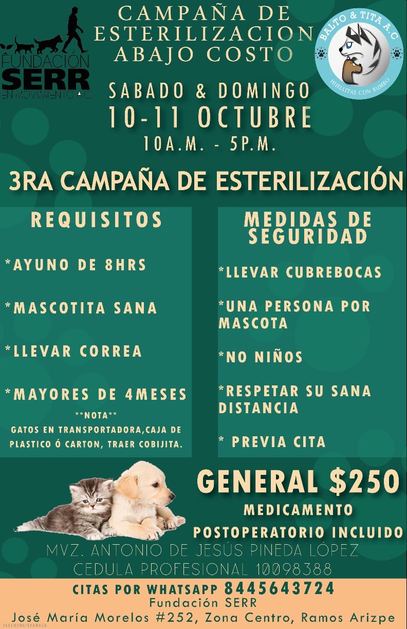 La fundación SERR, en colaboración con los activistas en defensa de los animales “Balto y Tita”, invitan este próximo sábado 10 y domingo 11 octubre a su campaña de esterilización de mascotas a bajo costo en Ramos Arizpe. La agrupación ha difundido a través de las redes sociales esta actividad con el fin de cuidar la no sobrepoblación y abandono de mascotas de compañía.