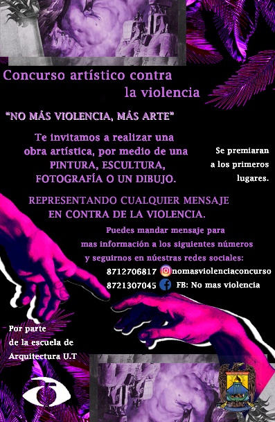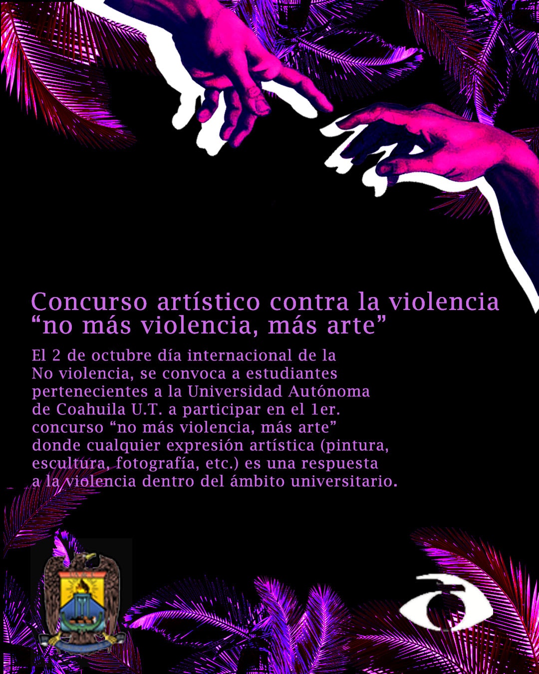 Torreón.- Con el fin de promover el arte como postura contra la violencia en el entorno universitario, la Escuela de Arquitectura convoca a estudiantes de la Unidad Torreón a participar en el Primer Concurso “No más violencia, más arte”, en el marco de la conmemoración del 2 de octubre, Día Internacional de la No Violencia.