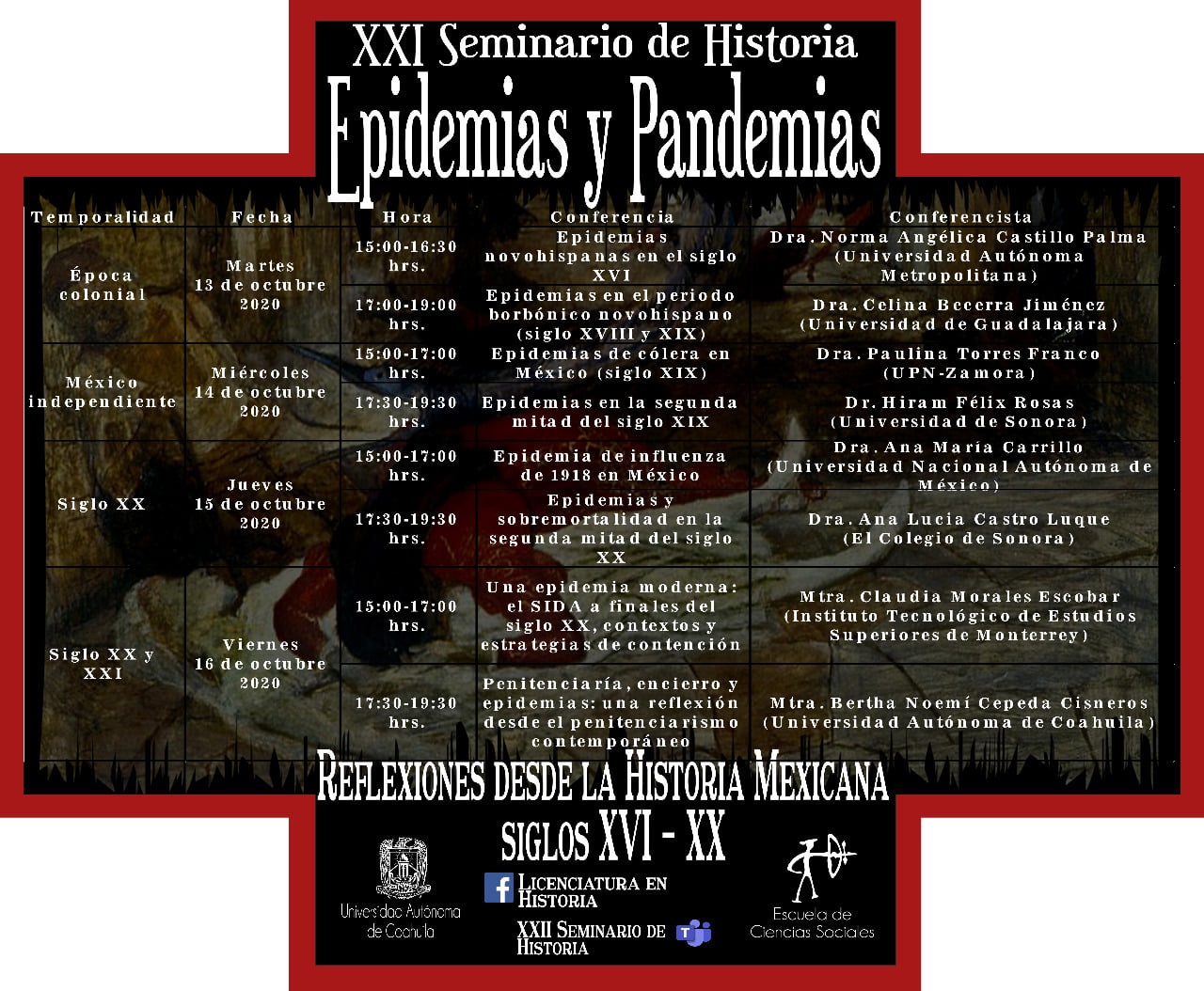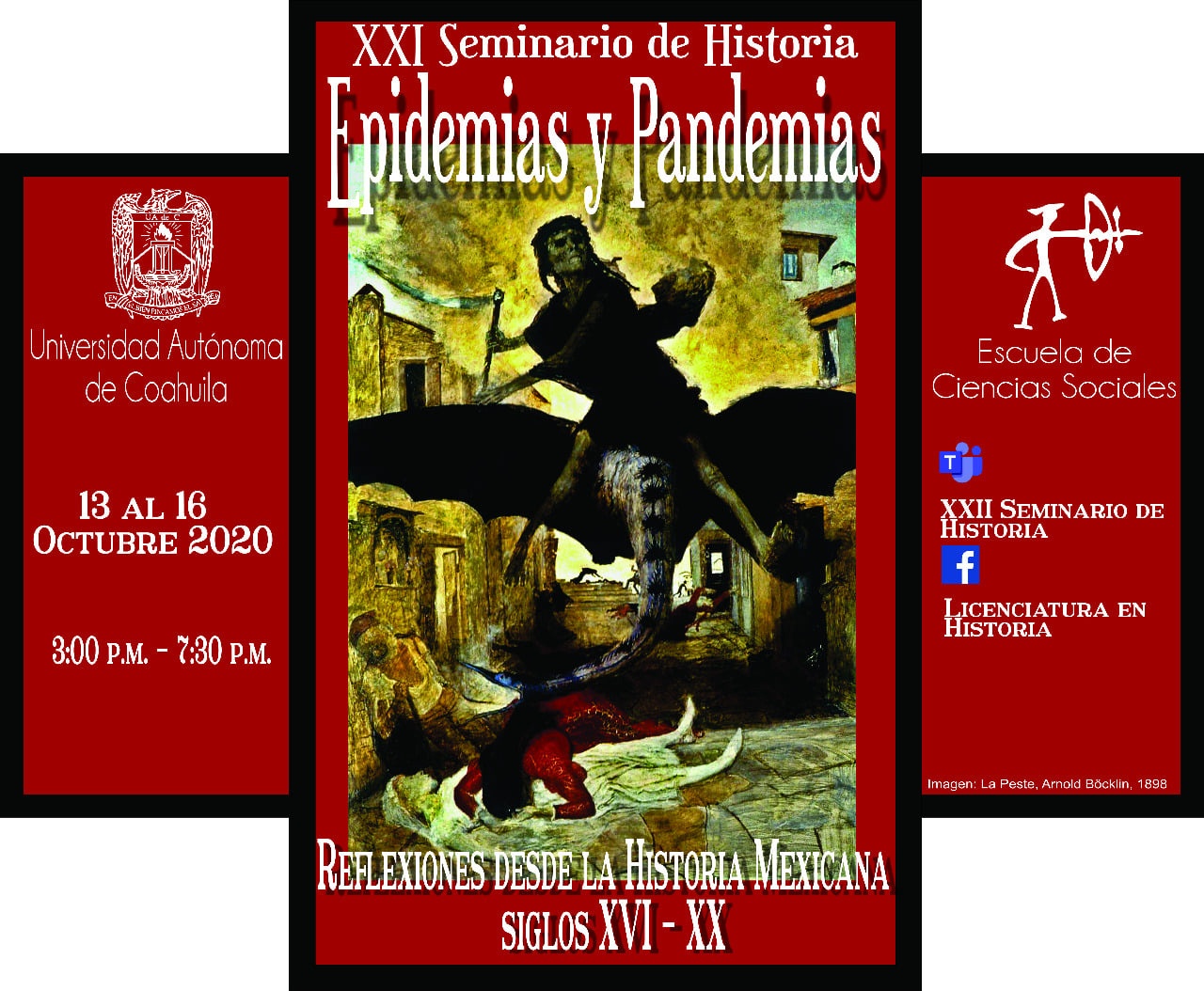 La Escuela de Ciencias Sociales de la Universidad Autónoma de Coahuila, invita a la comunidad universitaria y al público en general al XXII Seminario de Historia “Epidemias y Pandemias: Reflexiones desde la Historia Mexicana Siglos XVI–XX”, que se llevará a cabo del 13 al 16 de octubre de 2020 a través de la plataforma Microsoft Teams y la página oficial de Facebook “Licenciatura en Historia”.