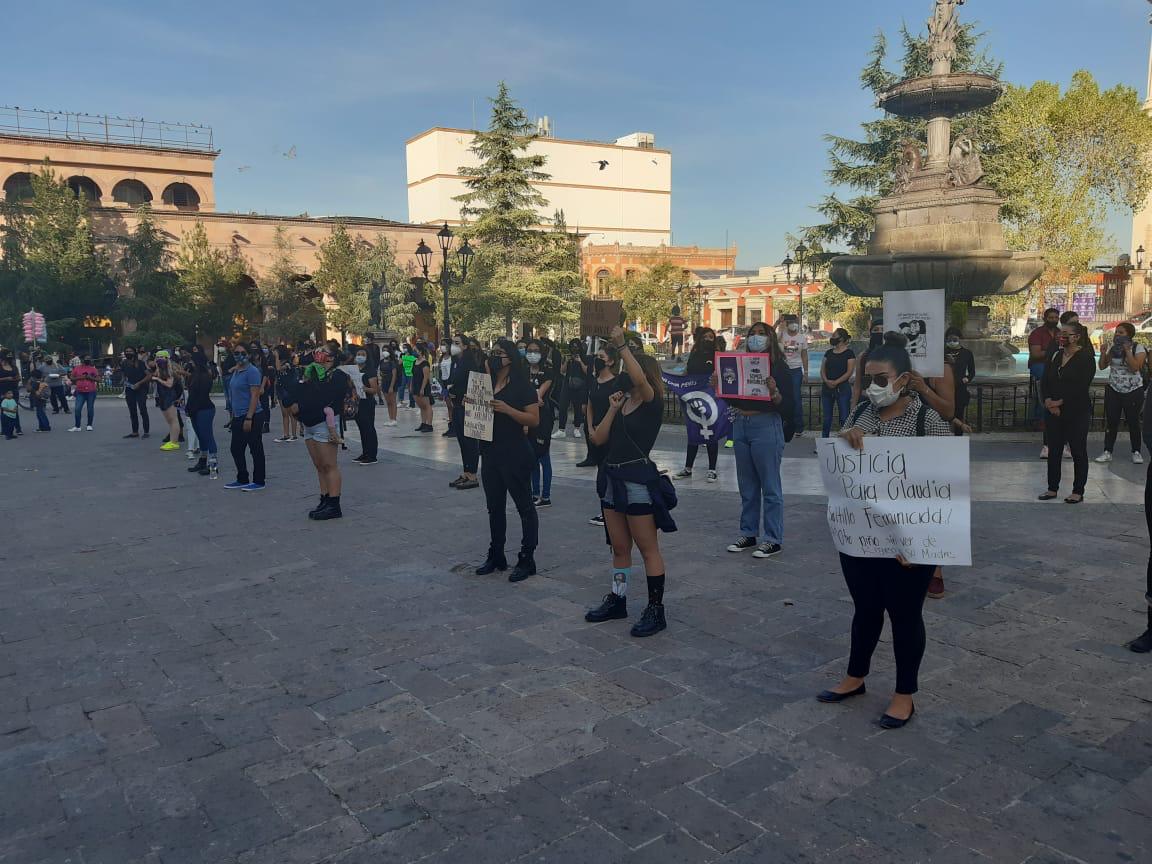 Al grito de ¡Nos falta Claudia!, ¡Que caiga con fuerza el feminicida! Y ¡Ni una más, ni una asesinada más!, las mujeres se dieron cita en Plaza de Armas, portando cartelones y colocando veladoras y fotografías de las víctimas de feminicidio frente a Palacio de Gobierno, mismo que fue resguardado por elementos de Fuerza Coahuila.