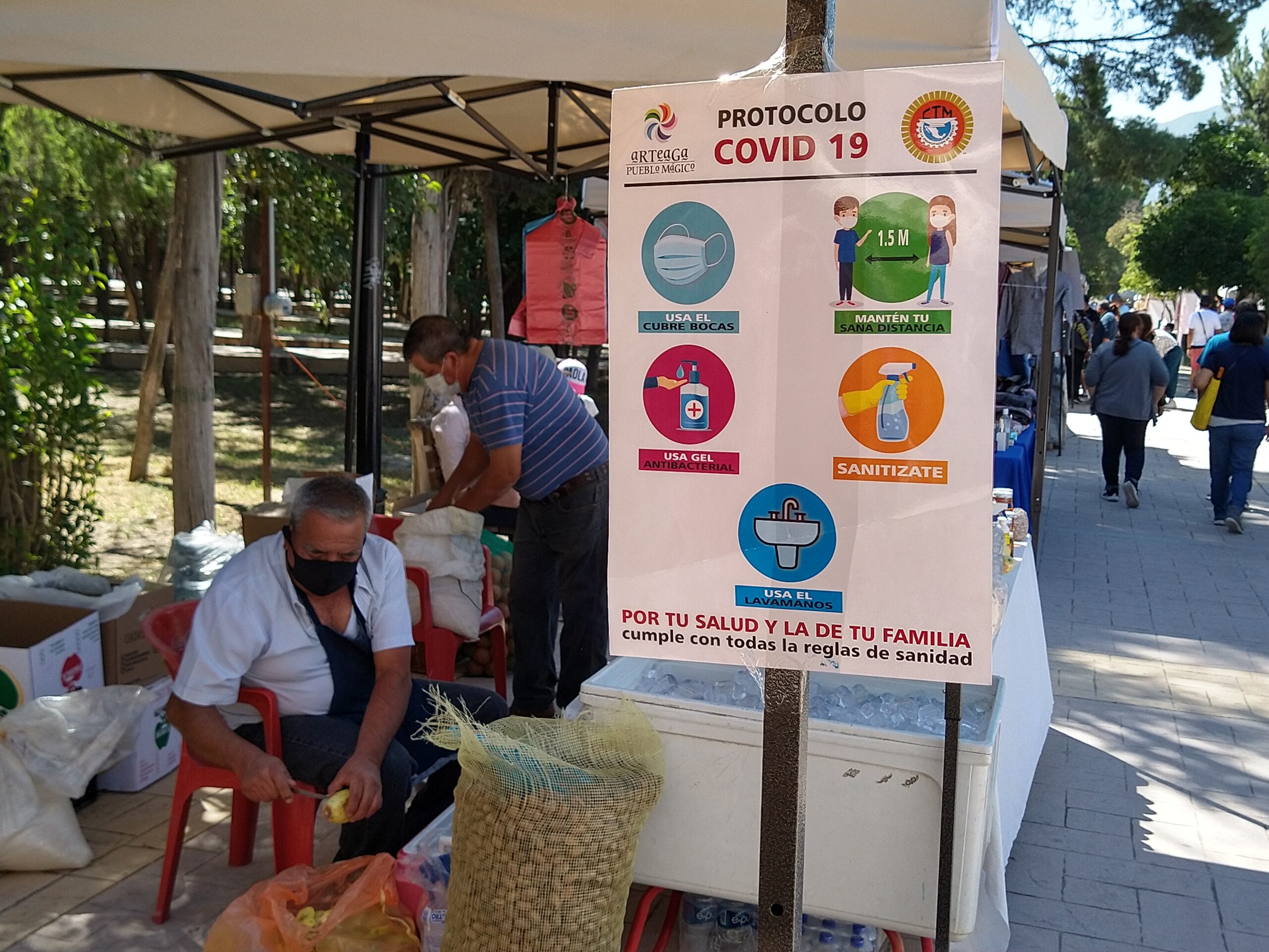“Es el primer día que están trabajando los comerciantes desde el inicio de la contingencia sanitaria, estamos aplicando el protocolo que debe existir en todo el mundo, tenemos los filtros donde se está tomando la temperatura a los asistentes, se está distribuyendo gel antibacterial, y hemos establecido una buena separación de los puestos para garantizar la sana distancia, además de promoverse el uso de cubrebocas, y distribuirse también estos objetos a quienes no lo lleven consigo”, dijo el munícipe.