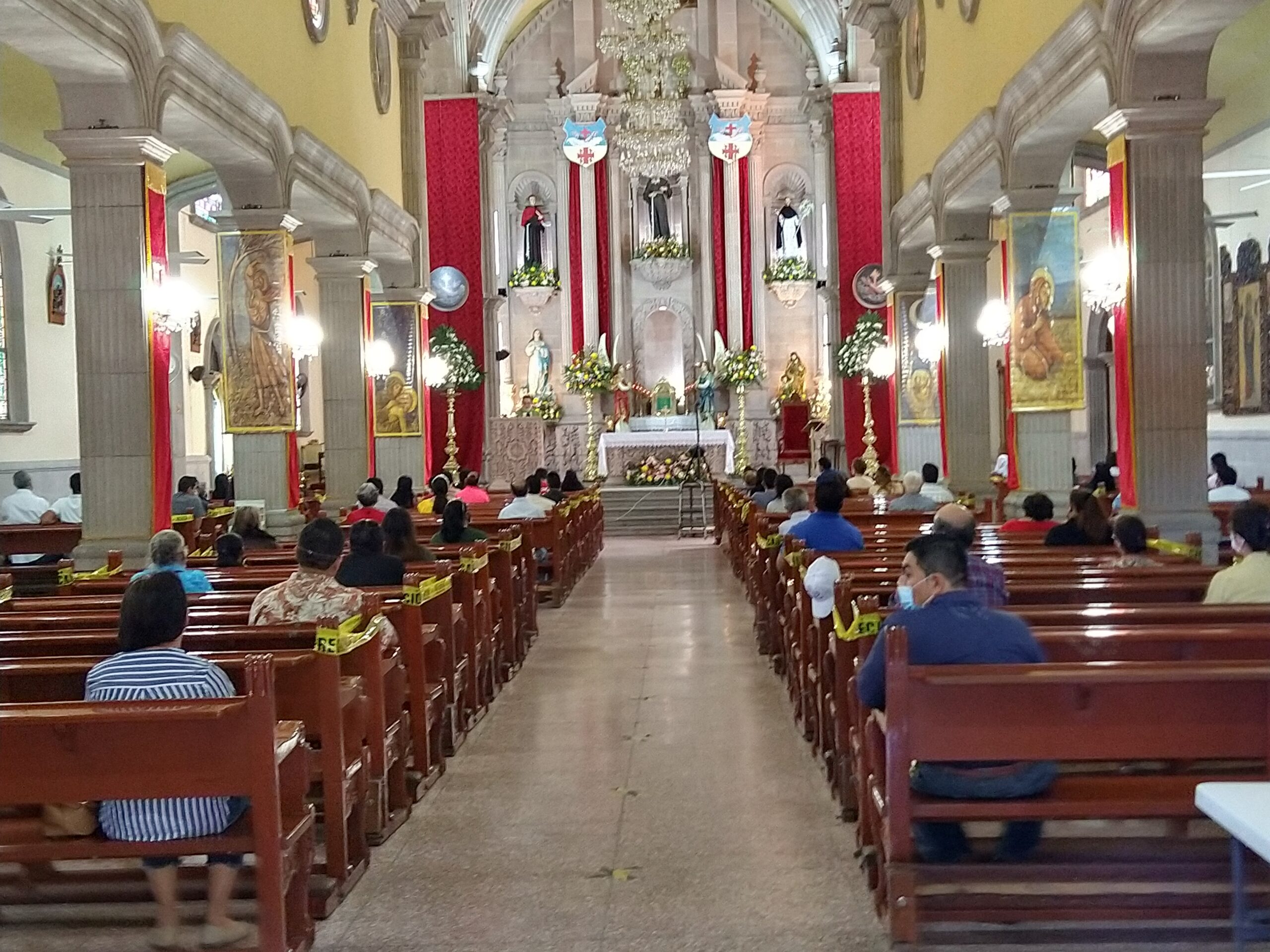 Como se ha informado, en los días previos se llevaron a cabo labores de sanitización en el mobiliario, y se dispuso la colocación de contenedores de gel antibacterial y tapetes desinfectantes en los diferentes accesos a los templos.