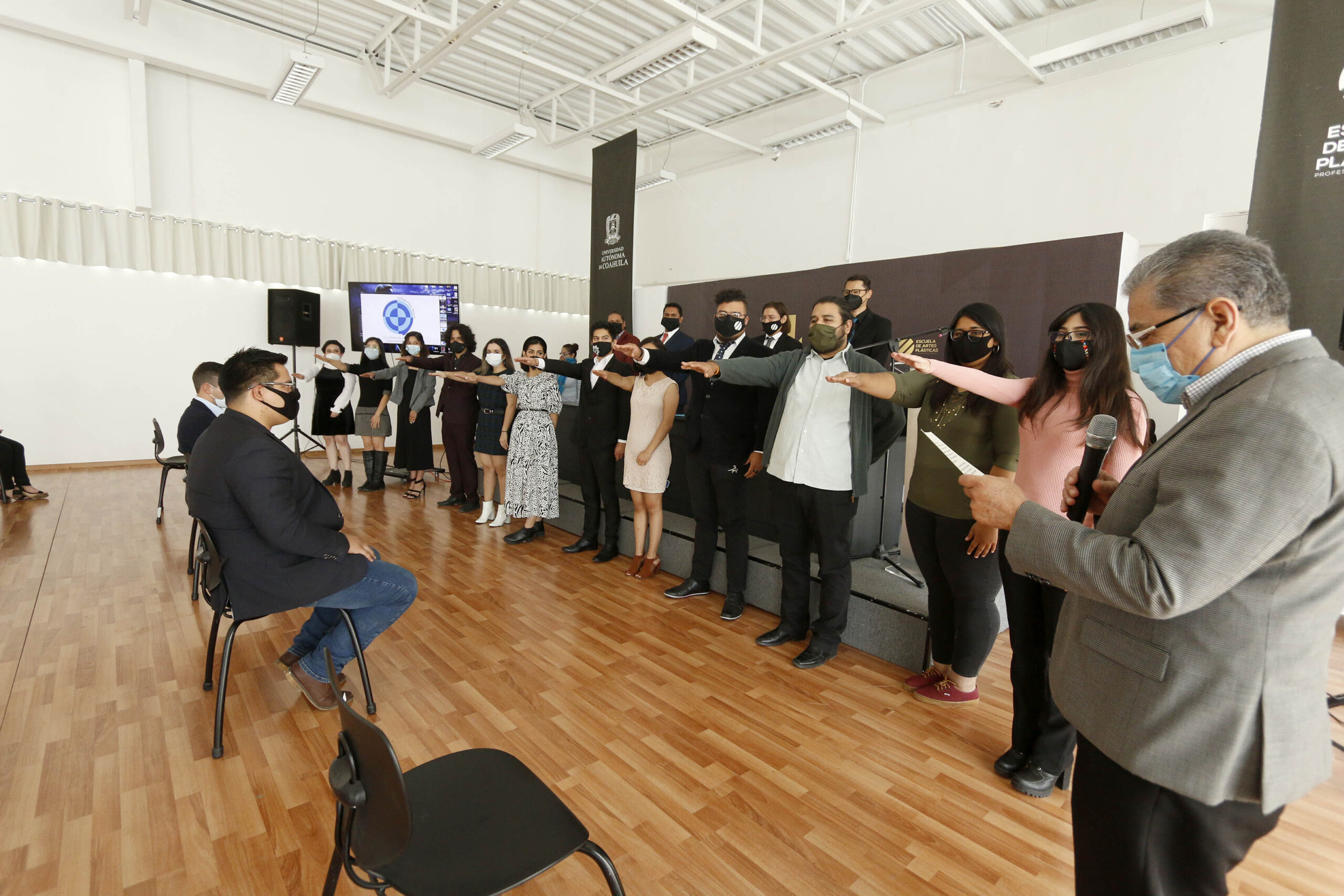 La ceremonia se realizó en la Sala de Exposiciones del plantel, donde estuvieron presentes el rector, Salvador Hernández Vélez, el director de la Escuela de Artes Plásticas, Darío D. Aguillón Gutiérrez, miembros de la saliente sociedad de alumnos “Johannes Itten” e integrantes de la planilla ganadora “Juntos” para el período 2020-2021.