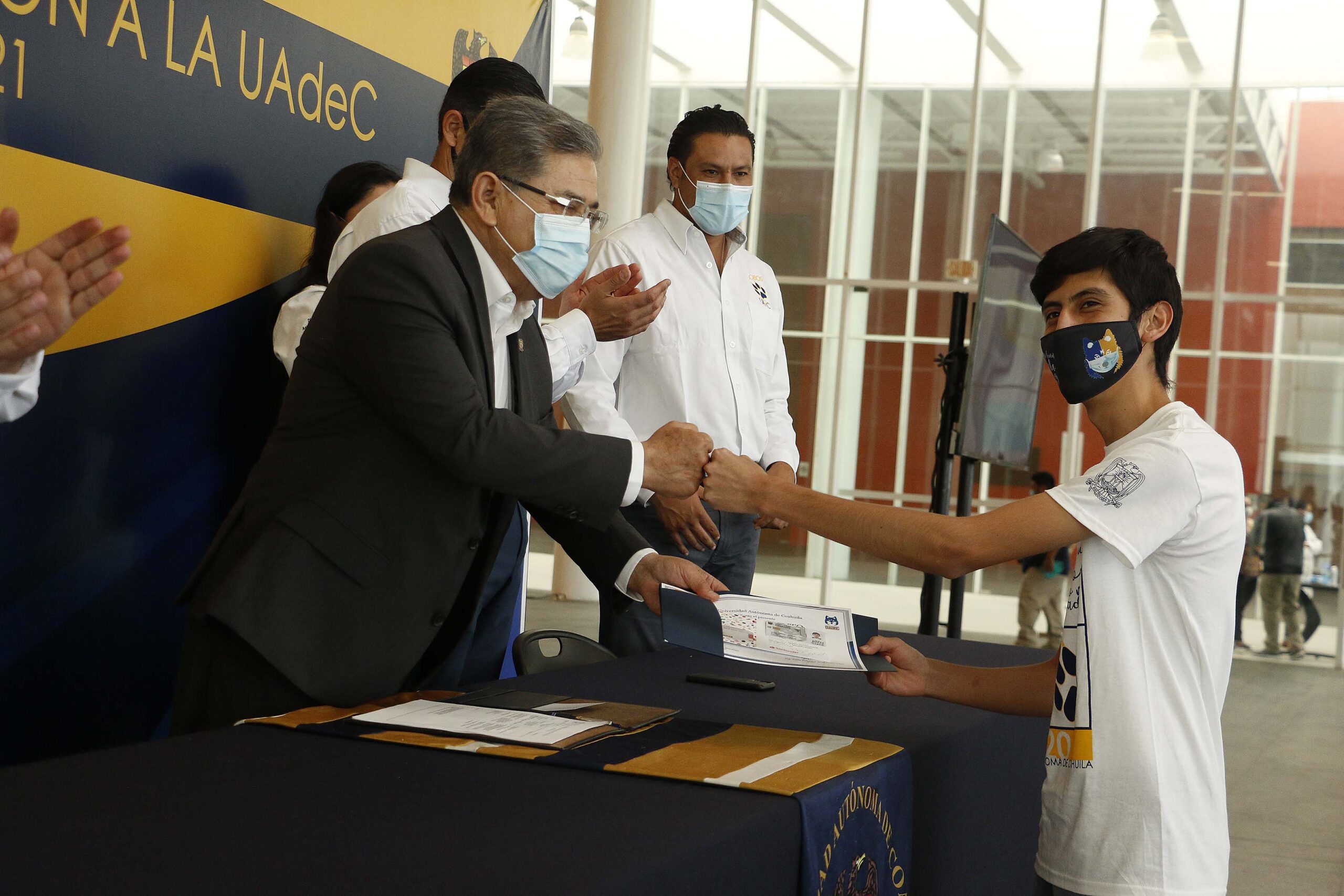 Los alumnos con más alta calificación en el Examen de Admisión recibieron por parte de las autoridades un diploma y la Credencial Oficial de la Universidad: de bachillerato se reconoció a Rene Alejandro Pérez Hernández de la Escuela de Bachilleres Ateneo Fuente y Benjamín Azamar Jostin de la Escuela de Bachilleres “Dr. Mariano Narváez González” Turno Vespertino.