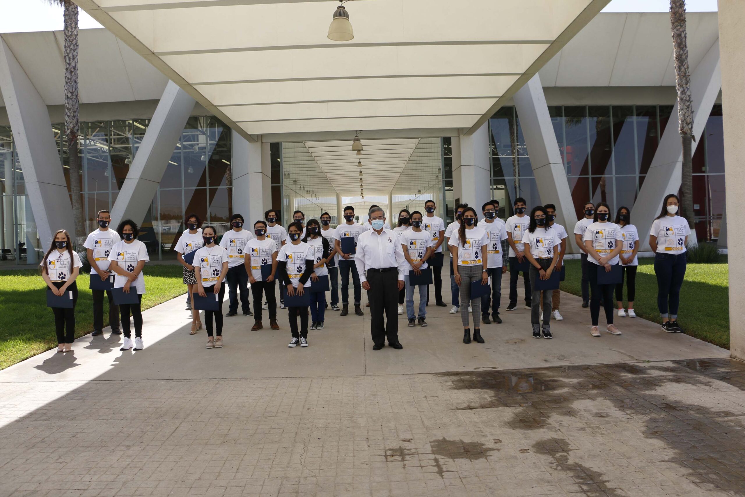 Ante alumnos con calificación destacada en el Examen de Admisión, y ante la comunidad universitaria que siguió la trasmisión en vivo por el Facebook de la Universidad, el Rector dio la bienvenida a los estudiantes de nuevo ingreso y les reiteró su orgullo porque forman parte de la gran familia de los Lobos, como una generación especial, pues es la primera que ingresa a la UA de C a través de un examen de admisión en línea.