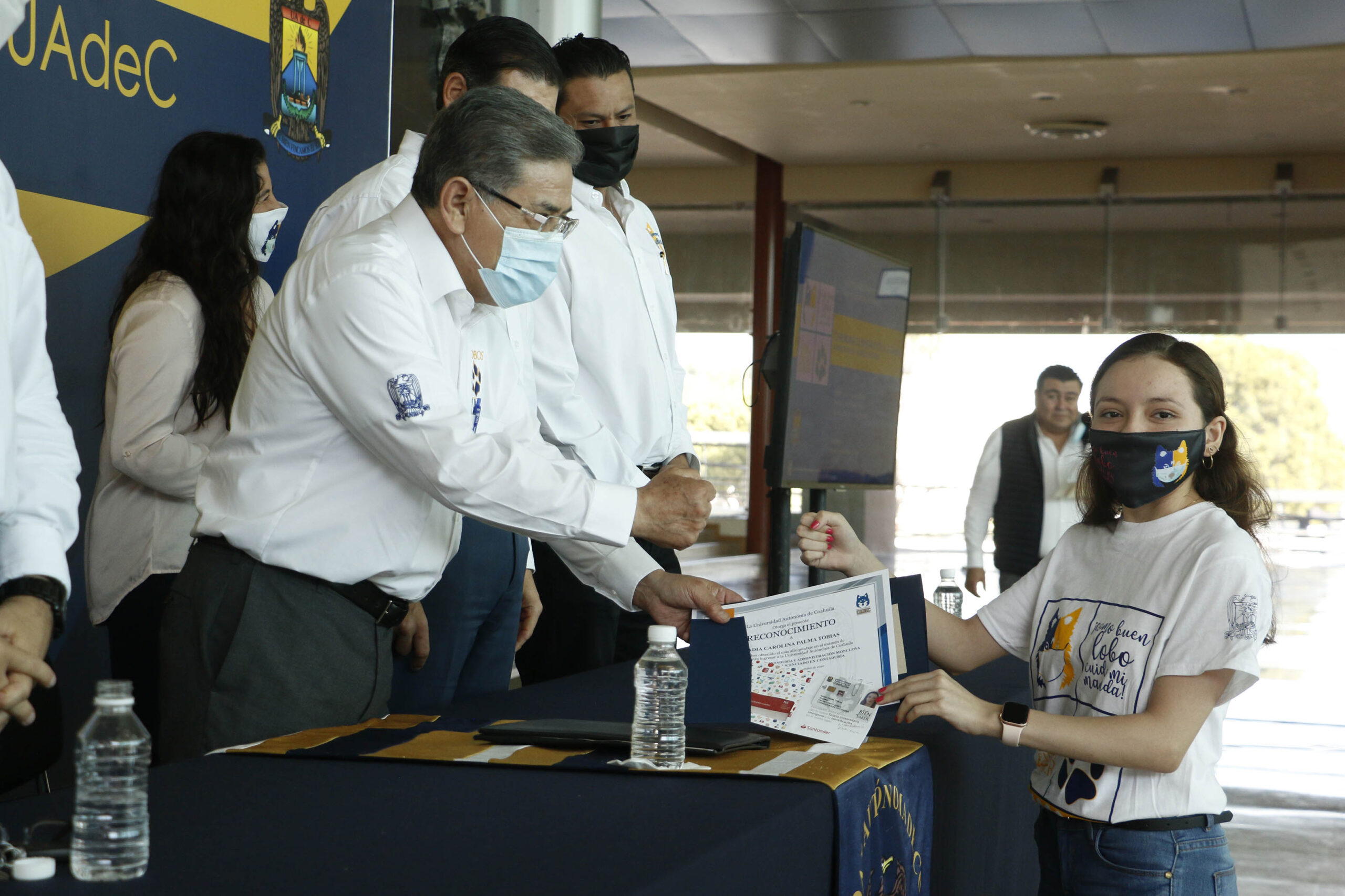 Felicitó a los alumnos de nuevo ingreso que obtuvieron los mejores puntajes y los exhortó a continuar esforzándose y alcanzar sus metas; señaló que son una generación única, pues su ingreso a la Universidad se realizó a través de un examen en línea lo que significó un reto, pero también una oportunidad para adaptarse a lo que el mundo actual requiere.