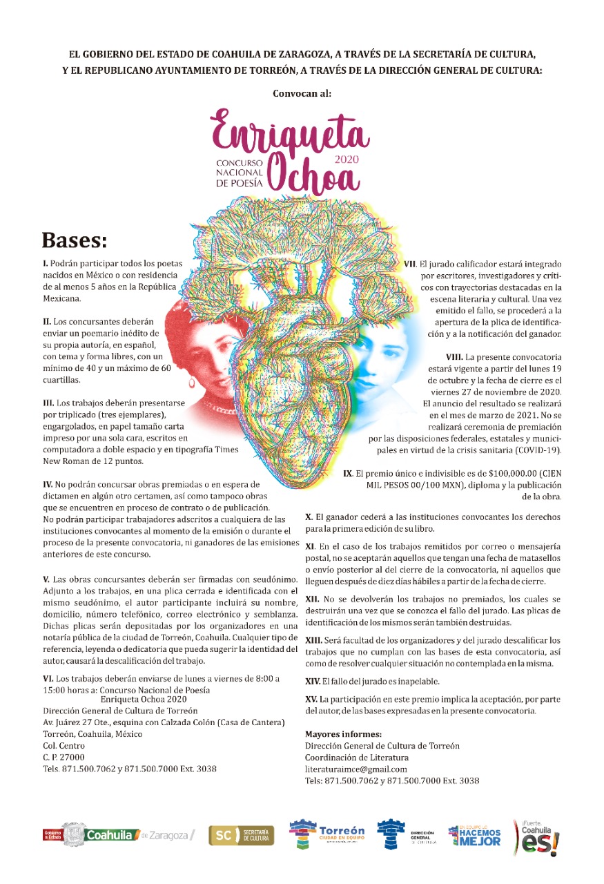 Torreón.- La Secretaría de Cultura, en coordinación con el Ayuntamiento de este municipio, dan a conocer la convocatoria del Concurso Nacional de Poesía “Enriqueta Ochoa” 2020, que estará vigente del 19 del presente mes hasta el 27 de noviembre de 2020.