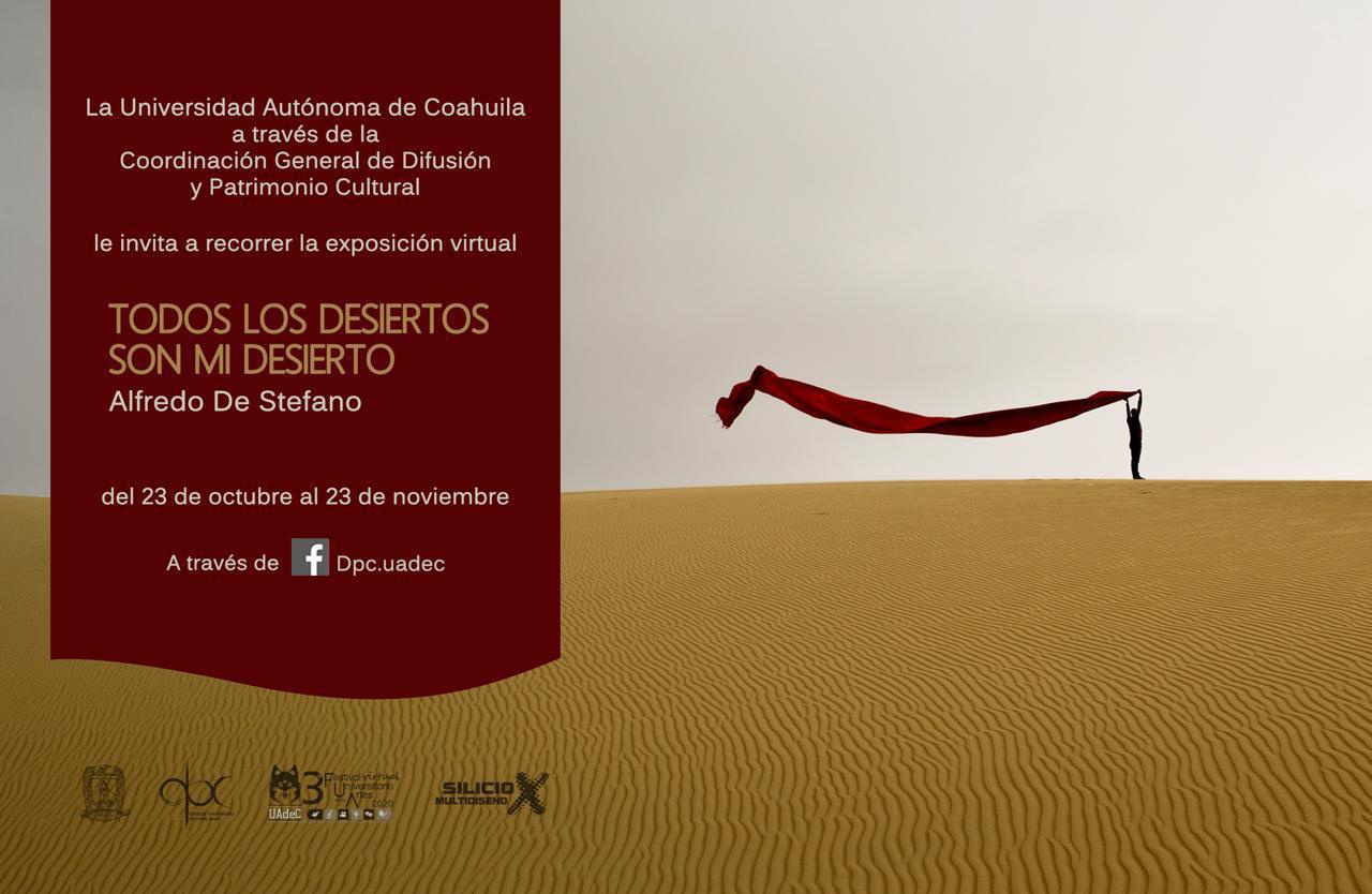 Tras compartir el mensaje de inauguración, se dará paso a la charla “Cuando la Ausencia se Volvió Presencia”, posteriormente se presentará la exposición virtual “Todos los Desiertos son mi Desierto”, de Alfredo De Stefano, la cual permanecerá en la página de Facebook del 23 de octubre al 23 de noviembre.
