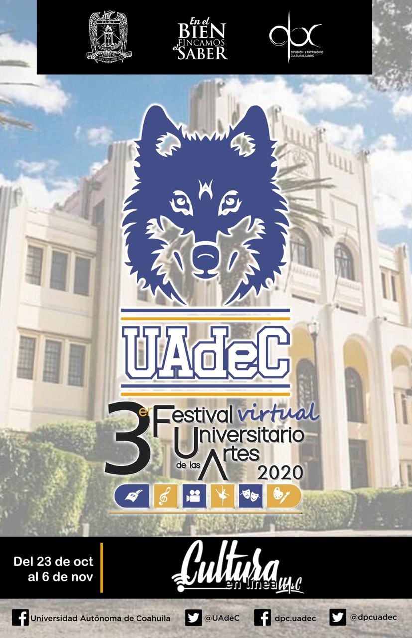 Consulta la cartelera en http://www2.uadec.mx/pub/dpc/FUA2020.pdf y se partícipe de los eventos como exposiciones, conciertos, conferencias y proyecciones que se llevarán a cabo del 23 de octubre al 6 de noviembre y que enmarcan el 63 aniversario de la Universidad Autónoma de Coahuila. (EL HERALDO)