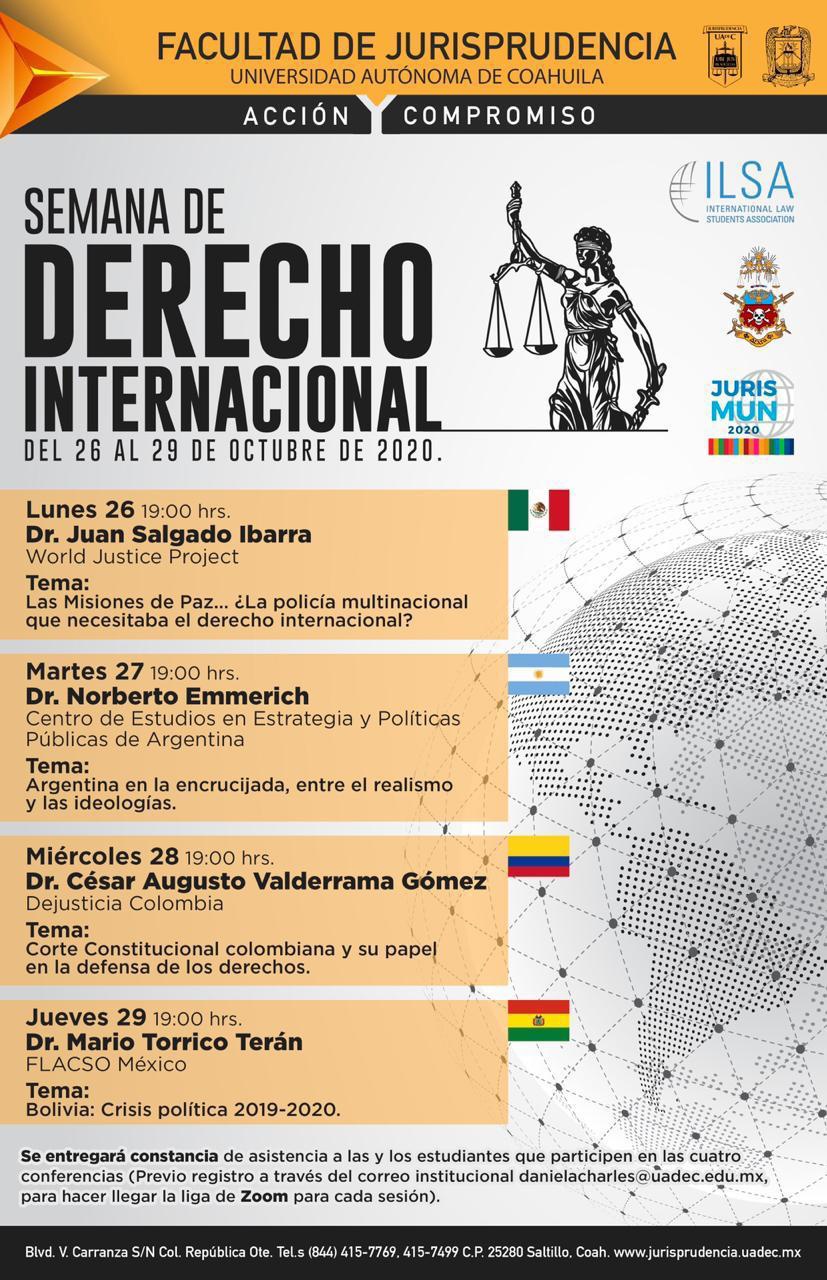 La Facultad de Jurisprudencia de la Universidad Autónoma de Coahuila convoca a estudiantes de Derecho e interesados en las Ciencias Jurídicas, a la “Semana de Derecho Internacional” del 26 al 29 de octubre, por medio de Zoom y a través de la página de Facebook “facdejuris.uadec”.