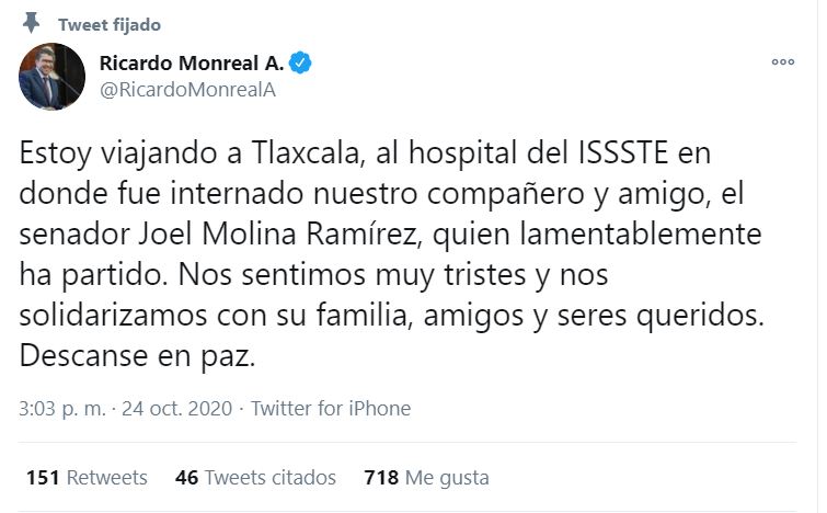 El presidente de México, Andrés Manuel López Obrador también publicó en Twitter: “Abrazo con afecto a familiares y amigos del profesor Joel Molina, senador de la República, quien falleció en Tlaxcala, su tierra natal. Siempre lo recordaremos por su abnegada entrega a favor de la transformación de México”.