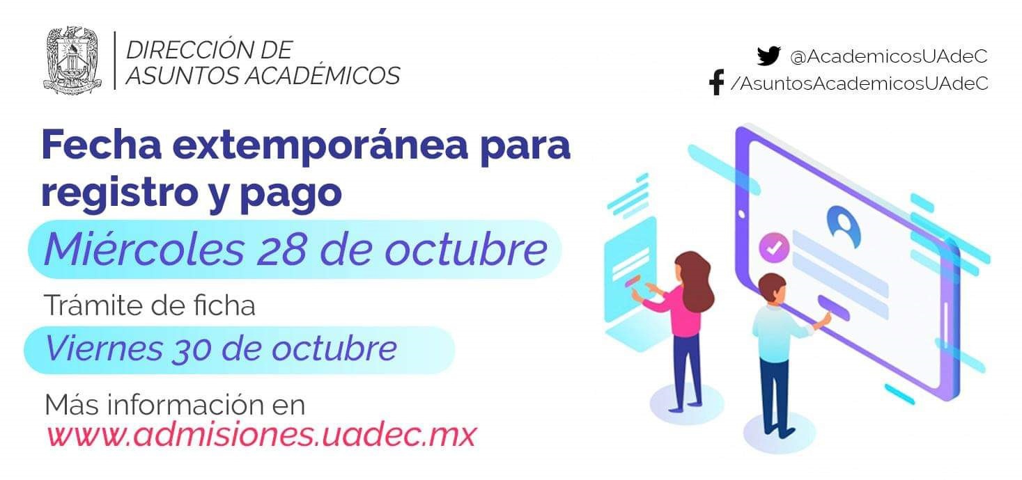 La Universidad Autónoma de Coahuila a través de la Dirección de Asuntos Académicos, informa que este miércoles 28 de octubre abre su registro extemporáneo para tramitar ficha del examen de admisión para el próximo semestre enero-junio 2021.