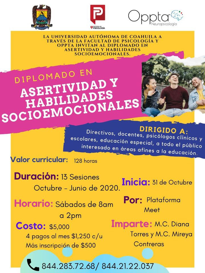 La Facultad de Psicología de la Universidad Autónoma de Coahuila en conjunto con el centro de orientación, psicológica, pedagógica y tanatológica “Oppta Neuropsicología” invitan a cursar el diplomado en Asertividad y Habilidades Socioemocionales.