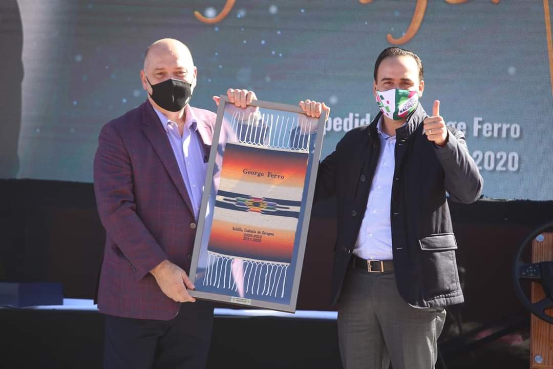 Además de la Llave de la Ciudad, Manolo Jiménez entregó a George Ferro un tradicional sarape de Saltillo con su nombre grabado.