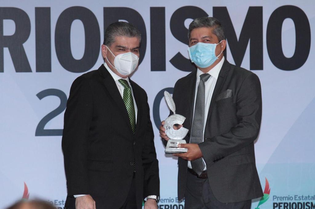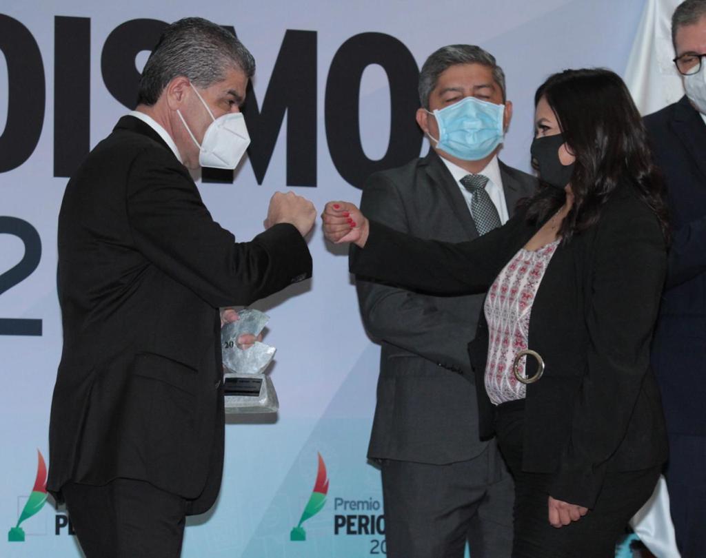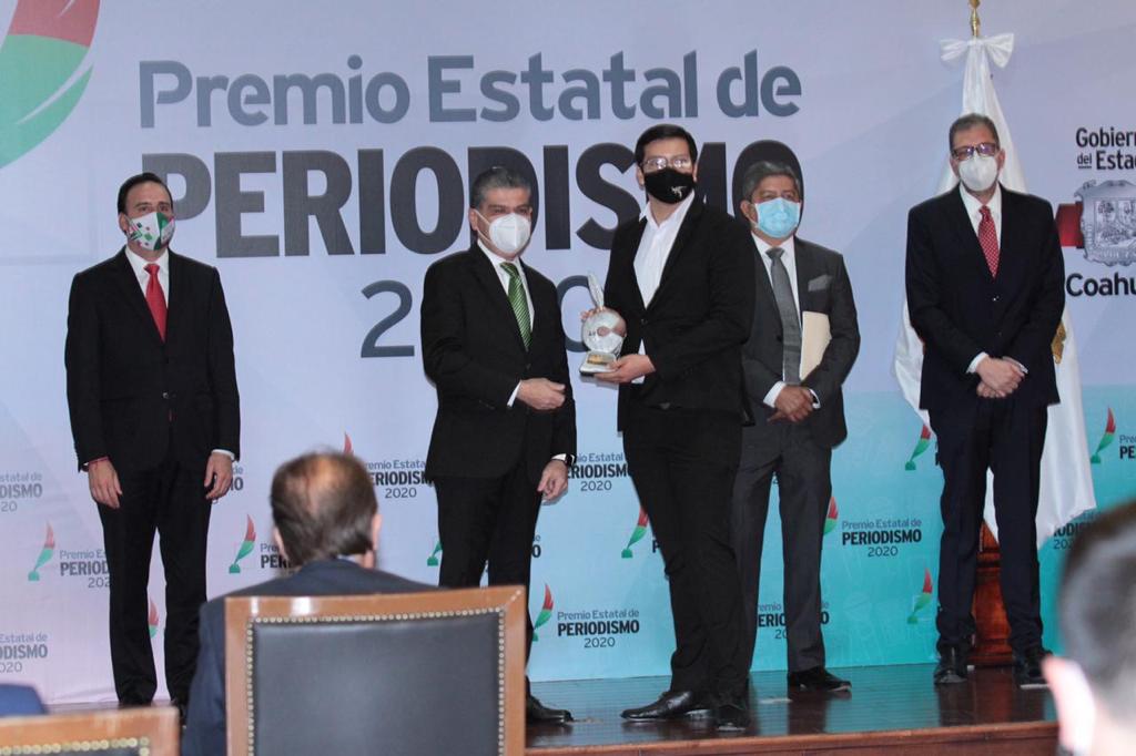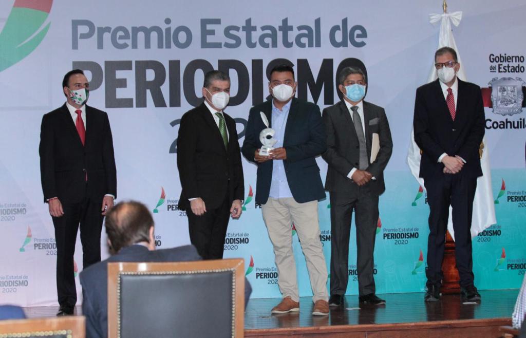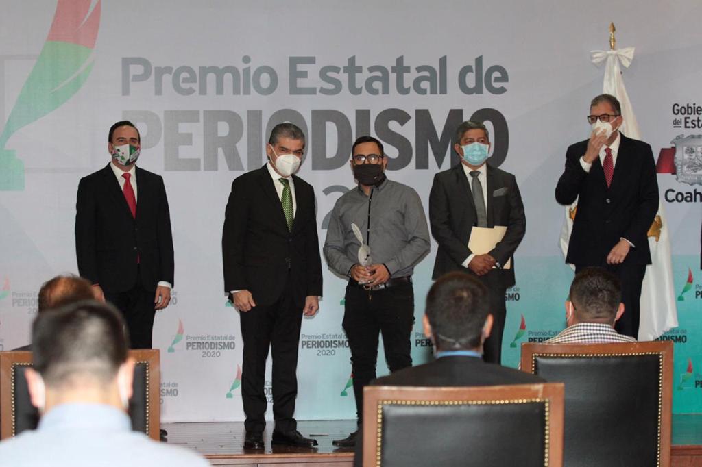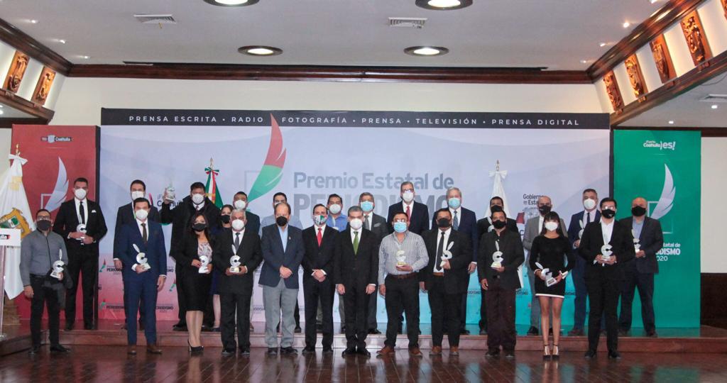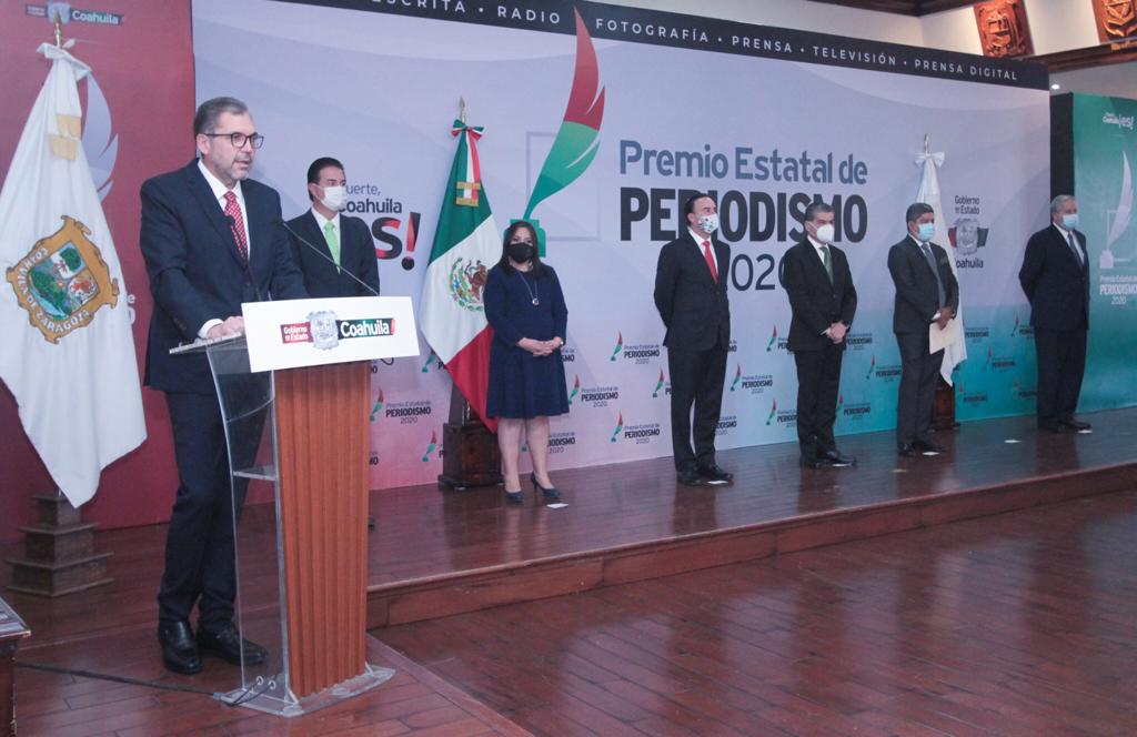 “El periodismo coahuilense se ha constituido en un enlace fuerte entre autoridades y ciudadanía, coadyuvante protector del bienestar de las familias y promotor activo de las estrategias de salud”, dijo el gobernador Miguel Ángel Riquelme Solís durante la ceremonia de entrega del Premio Estatal de Periodismo 2020, evento que se llevó a cabo en Palacio de Gobierno.