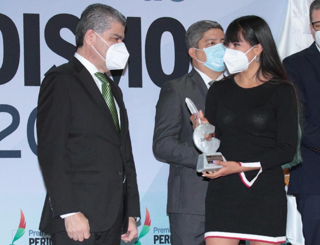 Acompañaron al Gobernador en esta ceremonia de entrega del Premio Estatal de Periodismo 2020, además, Manolo Jiménez Salinas, Alcalde de Saltillo; Jaime Bueno Zertuche, en representación del H. Congreso del Estado; María Luisa Valencia García, magistrada representante del Poder Judicial del Estado; José María Fraustro Siller, Secretario de Gobierno; Juan Manuel Dávila Udave, presidente de la Cámara de la Industria de Radio y Televisión Coahuila; Julián Anzaldúa Gutiérrez, coordinador general de Innovación y Desarrollo Productivo de la Universidad Autónoma de Coahuila.