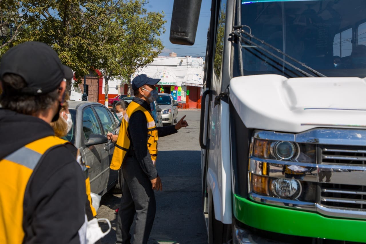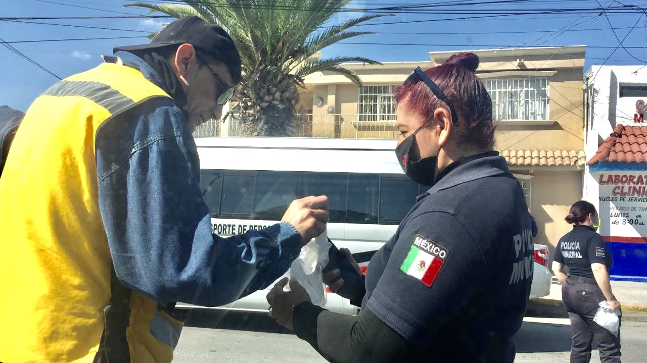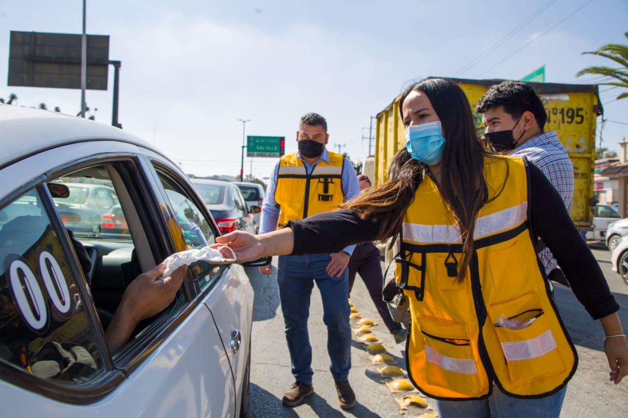 Este lunes Vigilantes de la Salud en Ramos Arizpe, acompañados de elementos de la Policía Municipal, entregaron de forma gratuita cubrebocas a los automovilistas y a peatones que transitaban por el cruce de los bulevares Plan de Guadalupe y Manuel Acuña en la colonia Eulalio Gutiérrez.