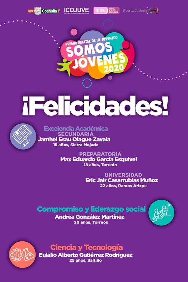 La Secretaría de Inclusión y Desarrollo Social del Estado, a través del Instituto Coahuilense de la Juventud (ICOJUVE), llevó a cabo la reunión de jurados para deliberar y dar a conocer a los jóvenes ganadores las distintas categorías del Premio Estatal de la Juventud “Somos Jóvenes 2020”