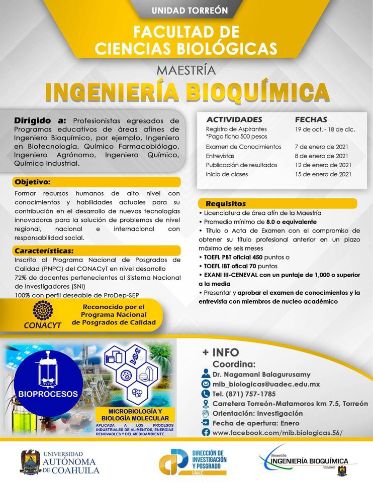 Torreón.- La Facultad de Ciencias Biológicas Unidad Torreón de la Universidad Autónoma de Coahuila convoca a egresados de licenciaturas en áreas del conocimiento afines a las ciencias químico-biológicas a cursar la maestría en Ingeniería Bioquímica que se apertura en enero de 2021.