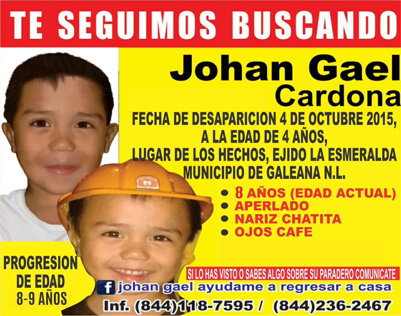 Johan Gael, desapareció el domingo 4 de octubre de 2015 a los 3 años, 8 meses de edad en el Rancho La Esmeralda, ubicado en la sierra de Galeana, en Nuevo León. Ese día, la familia Cardona de la Cruz fue de paseo, Johan permaneció a lado de su madre toda la mañana, sin embargo mientras Yahaira de la Cruz y su esposo recolectaban piñones, en cuestión de segundos Johan desapareció del vehículo en el que se encontraba sentado. Los padres se percataron de la llegada de un taxi color amarillo con personas desconocidas, así como de un carro color gris, posiblemente modelo Tsuru. Tras 5 años de búsqueda, el mes pasado, las autoridades de Nuevo León reabrieron el caso, volviendo al lugar de los hechos y descartando la posibilidad de que el menor cayera a algún pozo u hoyo cercano. Es un hecho que alguien se lo llevó, por lo cual la búsqueda de Johan Gael Cardona de la Cruz continúa. Además de la esperanza de tenerlo de vuelta en casa, la familia también pide a las autoridades justicia y que el responsable de la desaparición de su hijo pagué por el delito cometido.