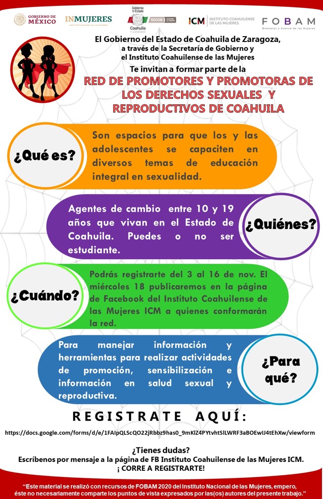 Uno de los principales objetivos del Gobierno del Estado de Coahuila es contar con herramientas útiles dirigidas a prevenir y eliminar todas las formas de violencia y discriminación por motivos de género, por tal motivo la Secretaria de Gobierno, a través del Instituto Coahuilense de las Mujeres (ICM), lanza la convocatoria para conformar la “Red de Promotores y Promotoras de los Derechos Sexuales y Reproductivos de Coahuila”.