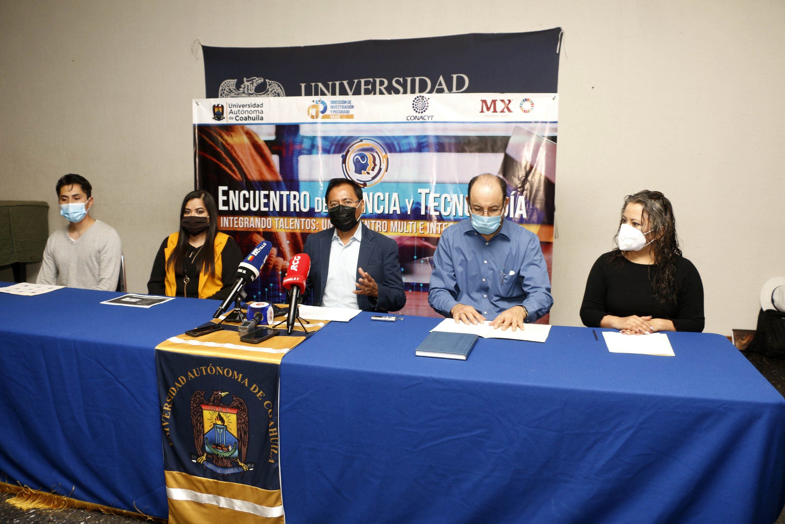 En rueda de prensa, el subdirector de Investigación de la Dirección de Investigación y Posgrado, David Castro Lugo, el subdirector de Posgrado, José Luis Martínez Hernández, el colaborador de Investigación y Posgrado, Daniel Ortiz Salas, de la subdirección de Investigación, Alejandra Oliva y de la Facultad de Enfermería, Reyna Torres, dieron a conocer los detalles del Encuentro.
