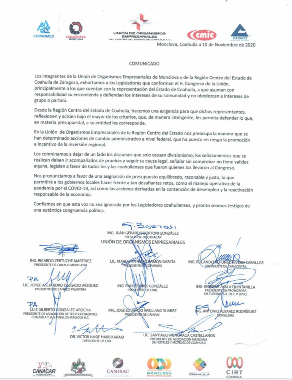 De la misma forama, empresarios de Monclova y la Región Centro hicieron un llamado a los Legisladores Federales que representan Coahuila, para que asuman con responsabilidad su encomienda y defiendan los intereses de su comunidad, y no obedezcan a intereses de grupo o partido. El documento firmado por Juan Gerardo Bortoni González, Presidente de CANACAR y líder de la Unión de Organismos Empresariales, se pronunció a favor de una asignación de presupuesto equilibrado, razonable y justo.