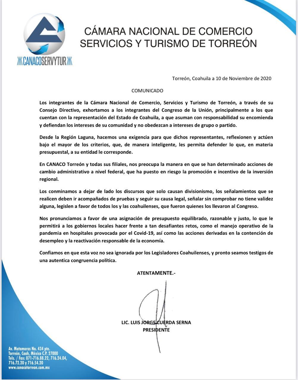 A través de un comunicado firmado por Luis Jorge Cuerda Serna, Presidente de la Cámara Nacional de Comercio Servicios y Turismo de Torreón, se hizo un llamado a los legisladores federals que representan a Coahuila a que asuman con responsabilidad su encomienda y defiendan los intereses de su comunidad y no obedezcan a intereses de grupo o partido.