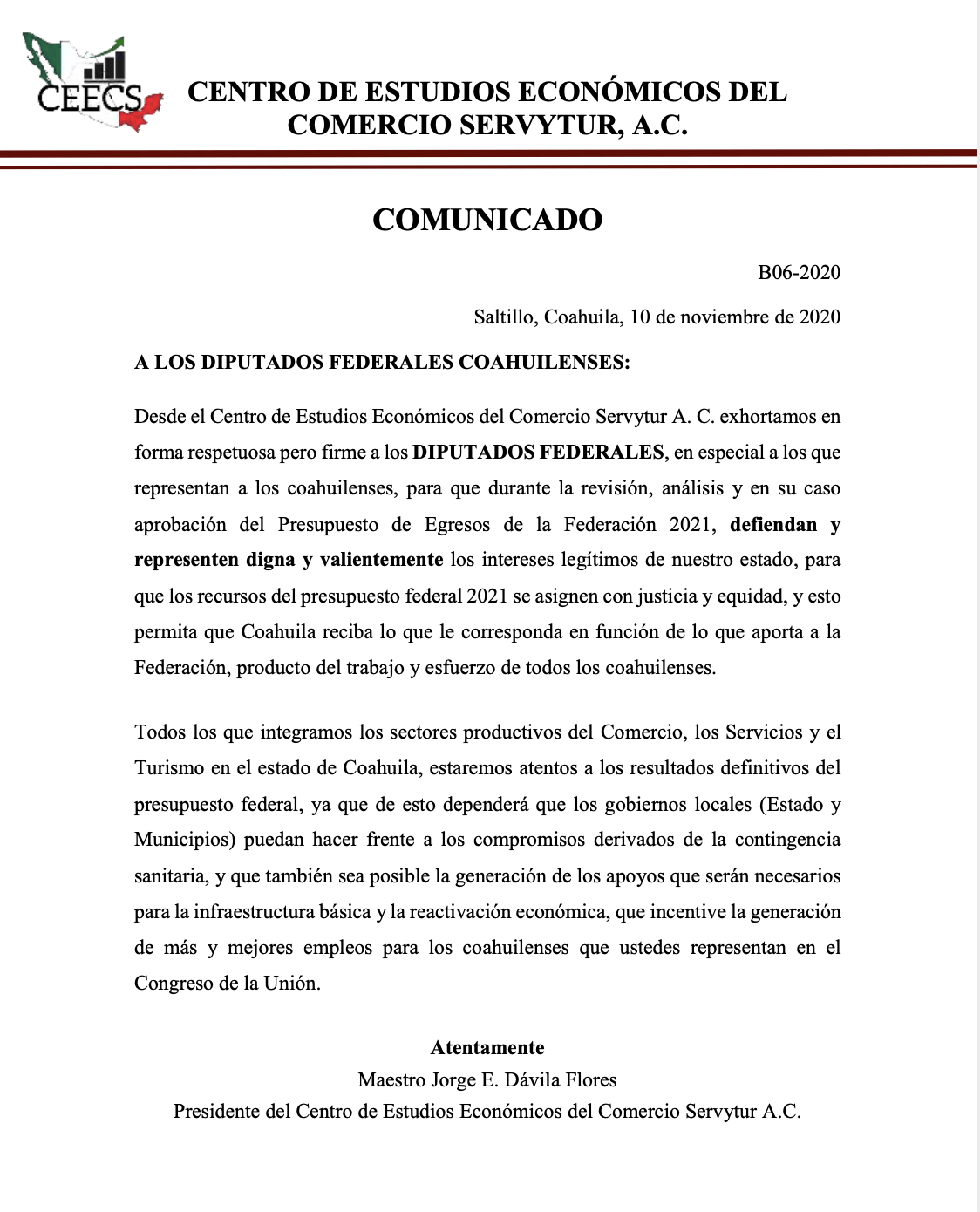 Por su parte, el Centro de Estudios Económicos del Comercio Servytur A. C. (CEECS), que preside Jorge Dávila Flores, exhortó a través de un comunicado a los diputados federales que representan Coahuila a que defiendan y representen los intereses del estado durante a revisión, análisis y en su caso aprobación del Presupuesto de Egresos de la Federación 2021. Lo anterior con el objetivo de que los recursos del presupuesto federal sean asignados con justicia y equidad para que Coahuila reciba lo que le corresponda.