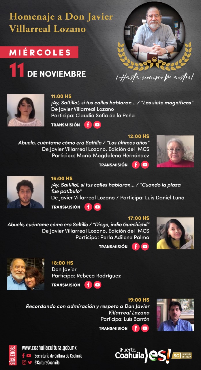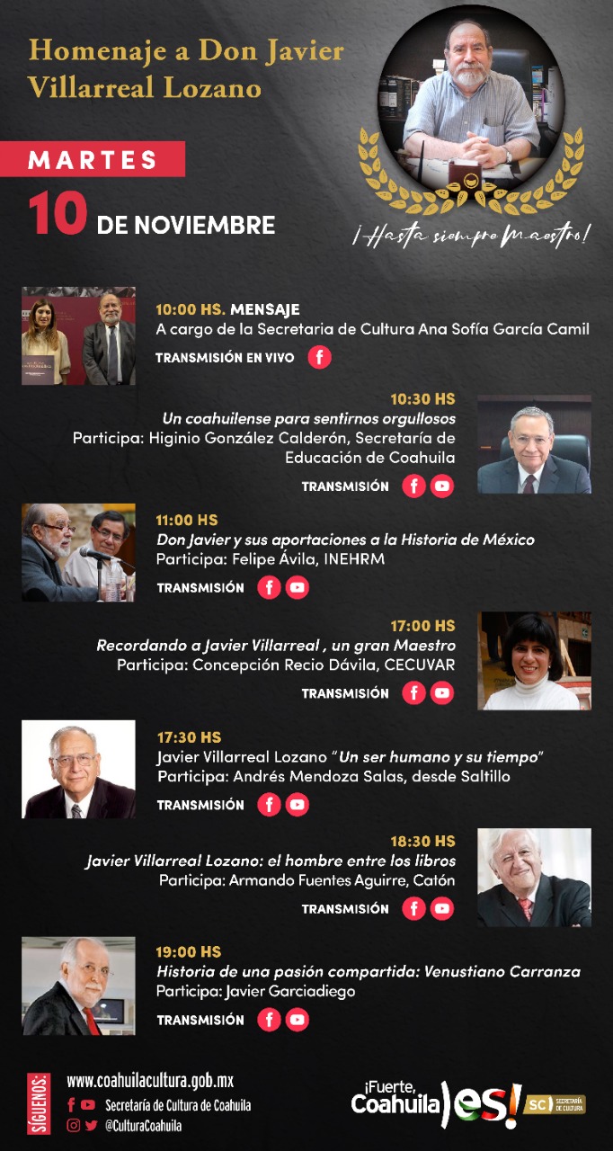 A las 17:30 horas continúa con “Javier Villarreal Lozano, un ser humano y su tiempo”, con el Director de Museos e Historia de la SC, Andrés Mendoza Salas. A las 18:30 horas, “Javier Villarreal Lozano: El hombre entre los libros”, con la participación del conocido columnista Armando Fuentes Aguirre “Catón”; y a las 19:00 horas “Historia de una pasión compartida: Venustiano Carranza”, con la participación de Javier García Diego.