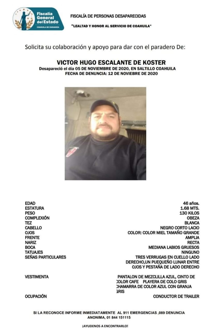 Fuentes cercanas a la Fiscalía General del Estado informaron que se trataba de Víctor Hugo Escalante de Koster de 46 años, quien se encontraba desaparecido desde el pasado 5 de noviembre del presente año.(EL HERALDO)