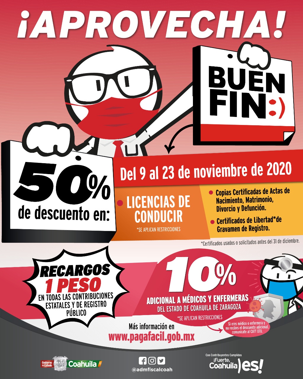 El Gobierno del Estado de Coahuila, a través de la Administración Fiscal General (AFG), te invita a que aproveches las grandes promociones en tus trámites en este Buen Fin 2020.
