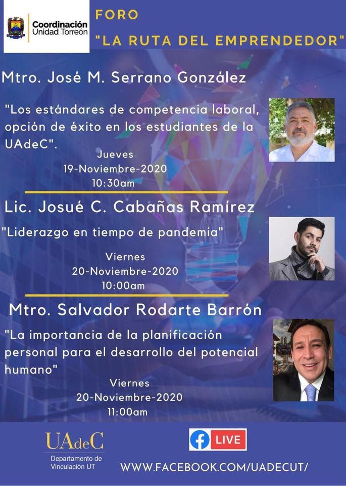 Torreón.- La Universidad Autónoma de Coahuila a través de la Coordinación de Unidad Torreón, invita al foro “La Ruta del Emprendedor”, que se llevará a cabo este jueves 19 y viernes 20 de noviembre de 2020.