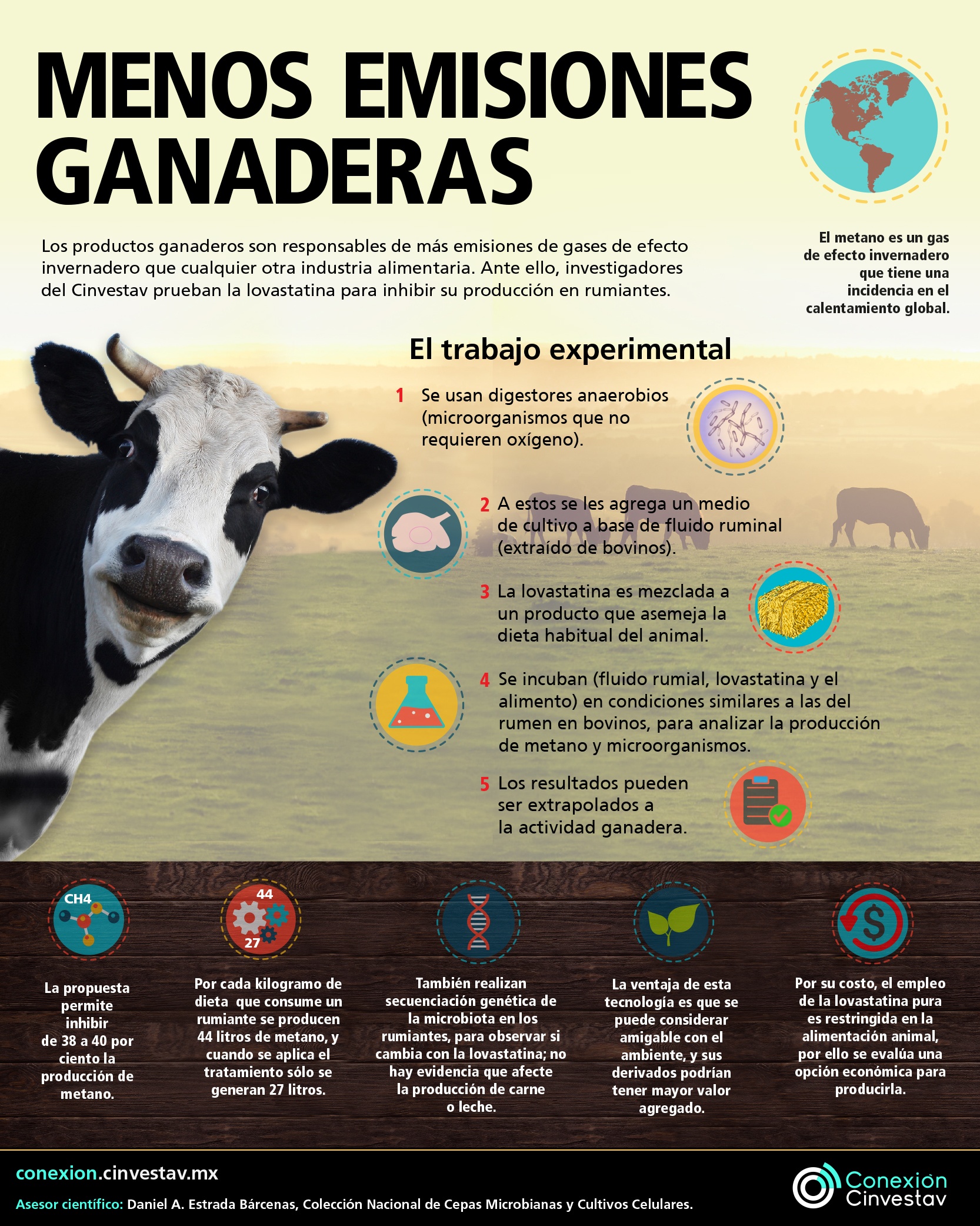 “A diferencia de otros productos antimetanogénicos, la aplicación de la lovastatina a nivel masivo es fácil porque los rastrojos fermentados se pueden mezclar de forma sencilla con cualquier tipo de dieta para ganado”, señaló Daniel Estrada Bárcenas. Bárcenas, investigador adscrito a la Colección Nacional de Cepas Microbianas y Cultivos Celulares.