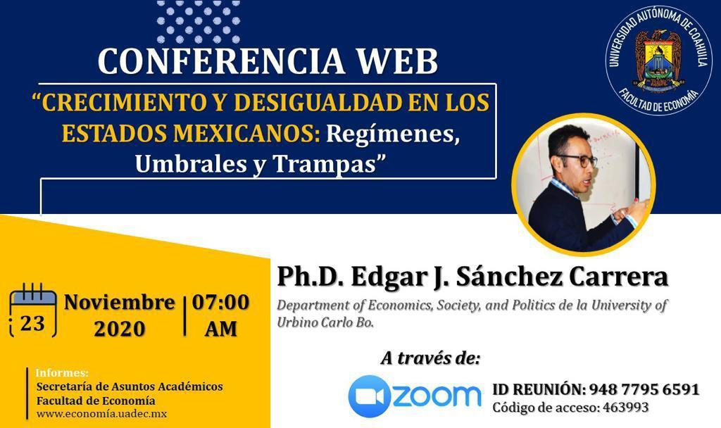 La Universidad Autónoma de Coahuila, a través de la Facultad de Economía, invita a la comunidad universitaria y público en general a participar en la Conferencia Web “Crecimiento y Desigualdad en los Estados Mexicanos: Regímenes, Umbrales y Trampas”, impartida por el Ph.D. Edgar J. Sánchez Carrera.