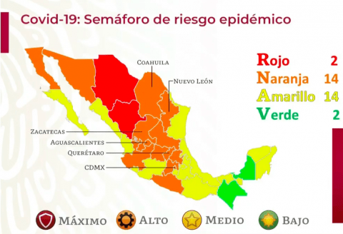 Sin embargo, la secretaría señaló que los estados de Aguascalientes, CDMX, Coahuila, Nuevo León, Querétaro y Zacatecas se encuentran en naranja pero con un mayor riesgo que los otros estados del mismo color.