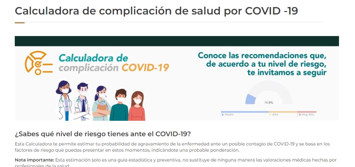Indicó que en la liga http://www.imss.gob.mx/covid-19/calculadora-complicaciones se pude consultar la calculadora, que también emite una serie de recomendaciones para mantenerse en casa e información particular según el rango de gravedad que puede llegar a tener cada persona.