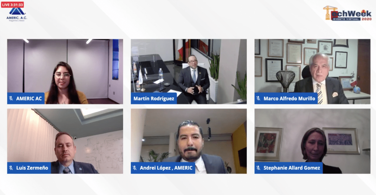 Finalmente, el presidente del COINE participó en la clausura de actividades de la Tech Week Virtual 2020, donde compartió cuadro con el Presidente de AMERIC, Andrei López Mondragón; la Delegada General de Québec en México, Stéphanie Allard-Gomez; el CEO de LUZCESA, Luis Zermeño Calderón; y el Vicepresidente de la Unión Mexicana de Asociaciones de Ingenieros A.C., Marco Alfredo Murillo Ruiz.