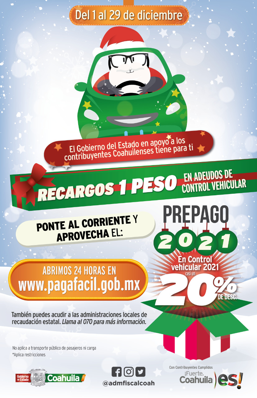 “Del 1 al 29 de diciembre todos los coahuilenses que deseen ponerse al corriente en sus Derechos de Control Vehicular podrán aprovechar esta promoción, y así realizar su Prepago 2021 y disfrutar de este gran descuento”, indicó Díaz González.