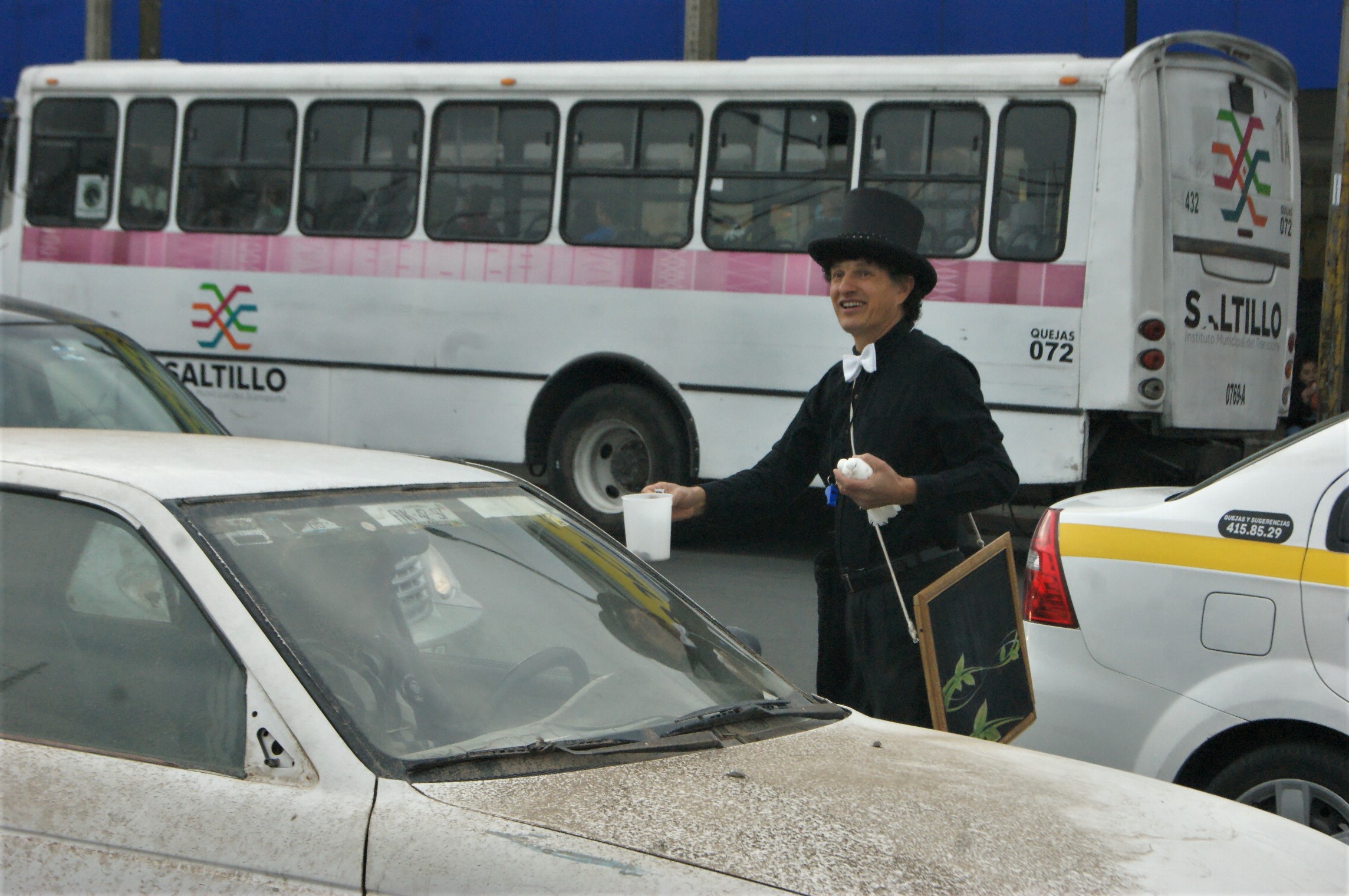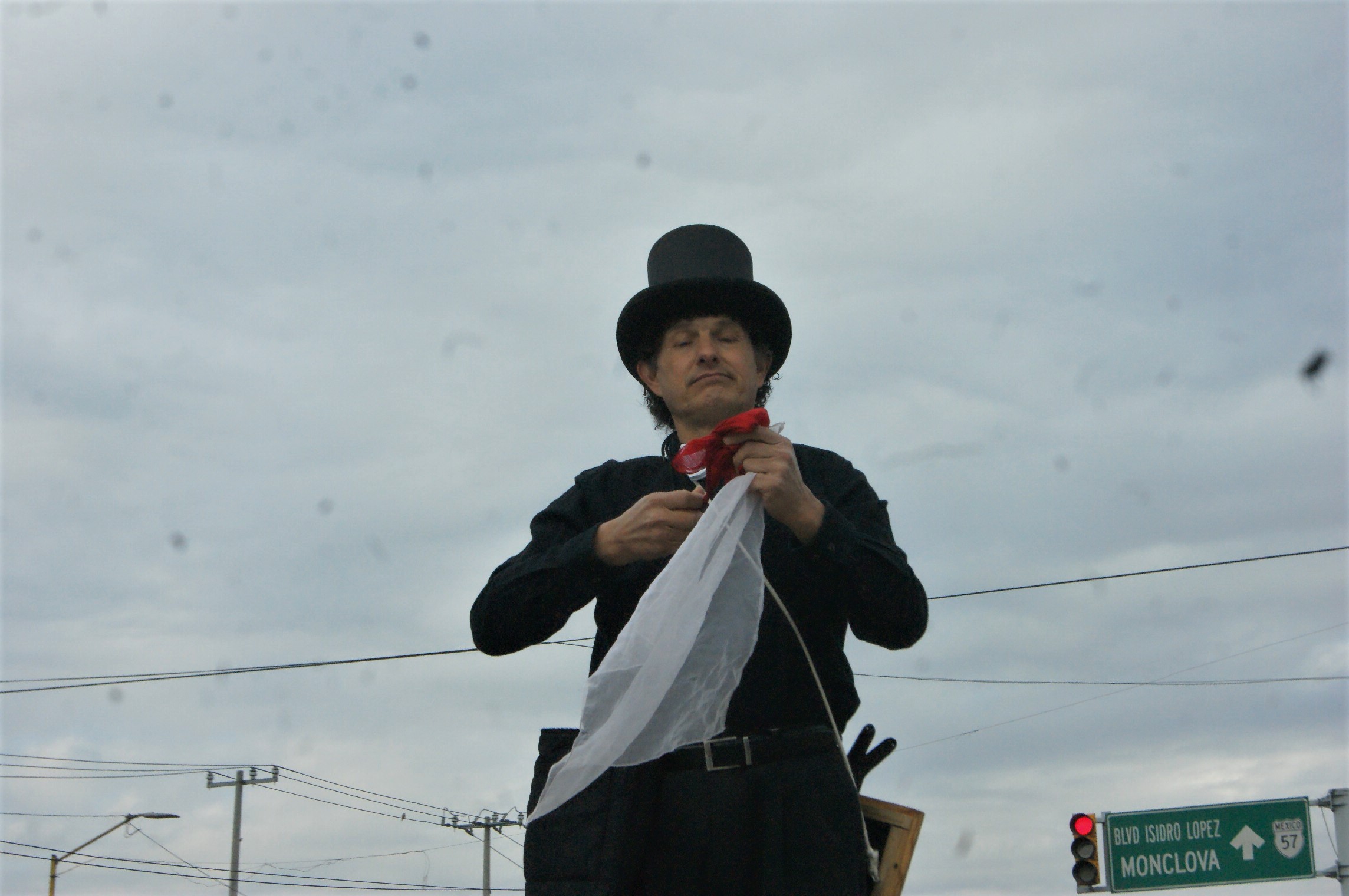 Con un sombrero y «varita mágica» en mano, este mago ofrece actos de magia para los automovilistas que transitan por esta zona. Frente a sus ojos, saca pañuelos de sus manos como si no tuvieran fin e incluso hace cobrar vida a una paloma pintada en un cuadro. El público contribuye con una moneda o billete, que apoya la economía de este artista que practica la magia desde niño.