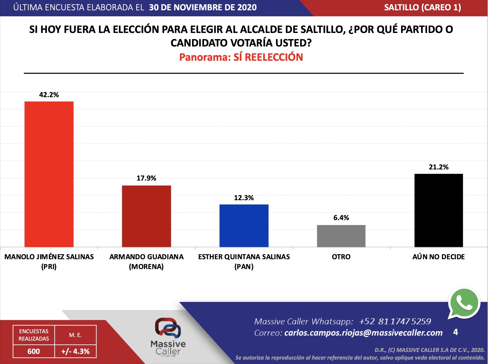 Masive Caller realizó encuestas en los diversos escenarios, entre los que se encuentra la reelección de Manolo Jiménez Salinas, en la cual se posiciona con la mayor intención de voto, aventajando por más de 2 a 1 a sus posibles contrincantes tanto de Morena como del PAN.
