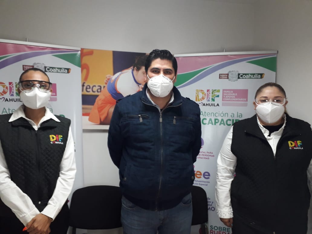 Desde la capital de estado, el Director de Familia Saludable y Apoyos Complementarios de DIF Coahuila, Josué Gabino Jiménez Flores, el Coordinador estatal de atención a la discapacidad y rehabilitación integral, Israel Cuellar Hernández y Miguel Ángel Ruelas Ojeda, responsable estatal del Programa de Inclusión, expusieron las estrategias y acciones prioritarias impulsadas por este Sistema para mantener el servicio de trasporte especializado UNEDIF con los protocolos y cuidados a la salud establecidos por las autoridades sanitarias.
