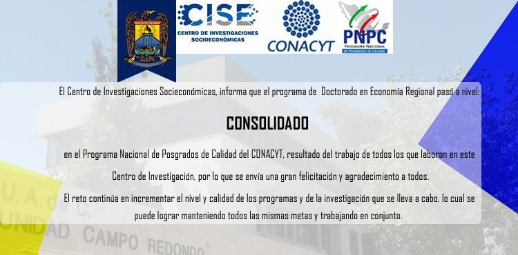 El Doctorado en Economía Regional del Centro de Investigaciones Socioeconómicas (CISE) de la Universidad Autónoma de Coahuila, pasó a nivel Consolidado dentro del Programa Nacional de Posgrados de Calidad (PNPC) del CONACYT como resultado del trabajo de los integrantes del Centro de Investigación.