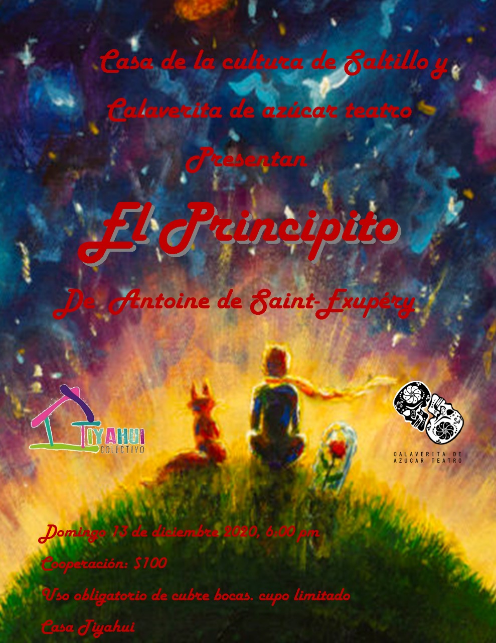 Los alumnos del taller de Calaverita de Azúcar Teatro realizarán –el próximo 13 de diciembre, a las 6:00 de la tarde– una obra de teatro basada en la novela corta del escritor y aviador francés Antoine de Saint-Exupéry. Las reservaciones y accesos –con valor de $100.00 pesos por persona– están disponibles enviando mensaje vía WhatsApp al 844 668 3781.