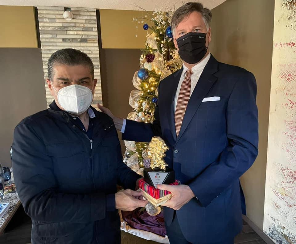 El Gobernador de Coahuila, Miguel Ángel Riquelme Solís, se reunió con el Embajador de Estados Unidos en México, Christopher Landau, para compartir diversos temas, como el de seguridad y las áreas de oportunidad de la entidad dentro del Tratado entre México, Estados Unidos y Canadá (T-MEC).
